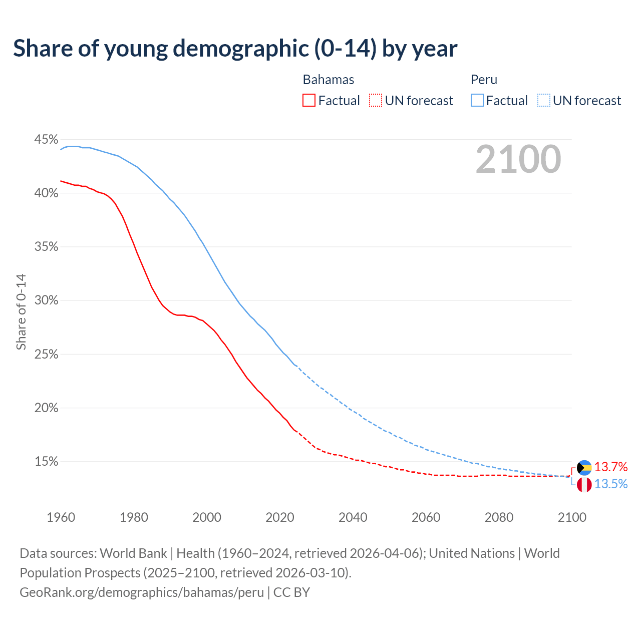 - The share of young demographic (0-15 years old) in the Bahamas is 17.9% vs 24% in Peru.