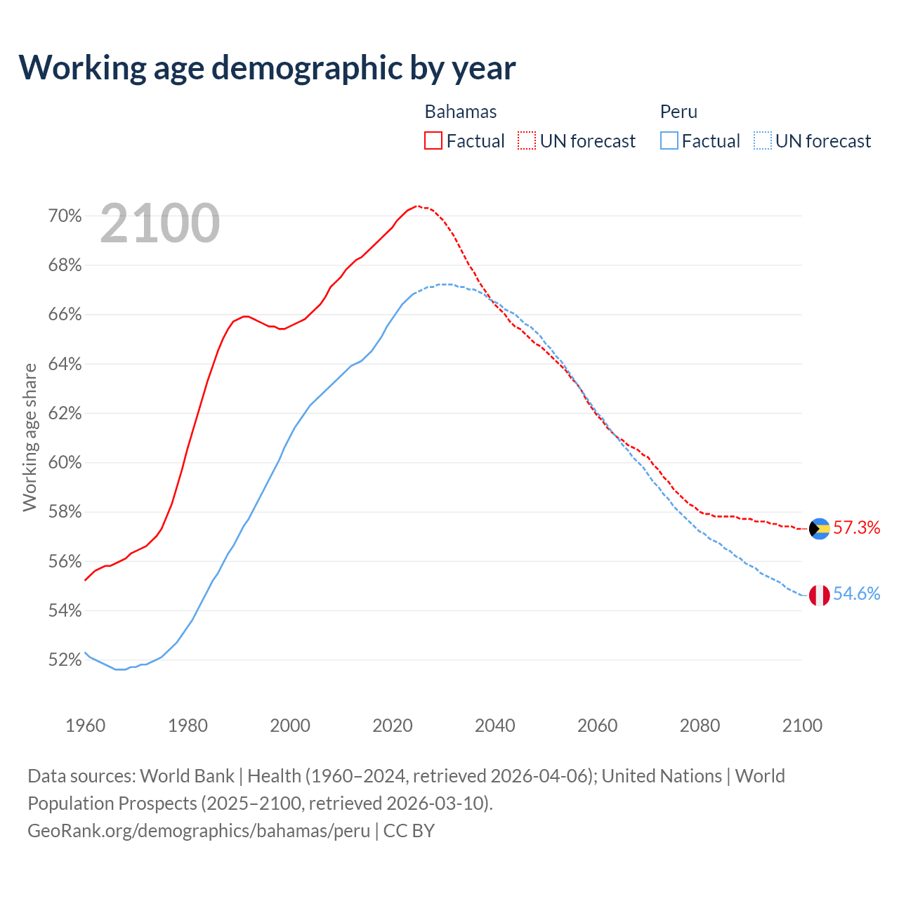 - The Bahamas has 285K working age adults (aged 15-64) vs 23.4M in Peru.