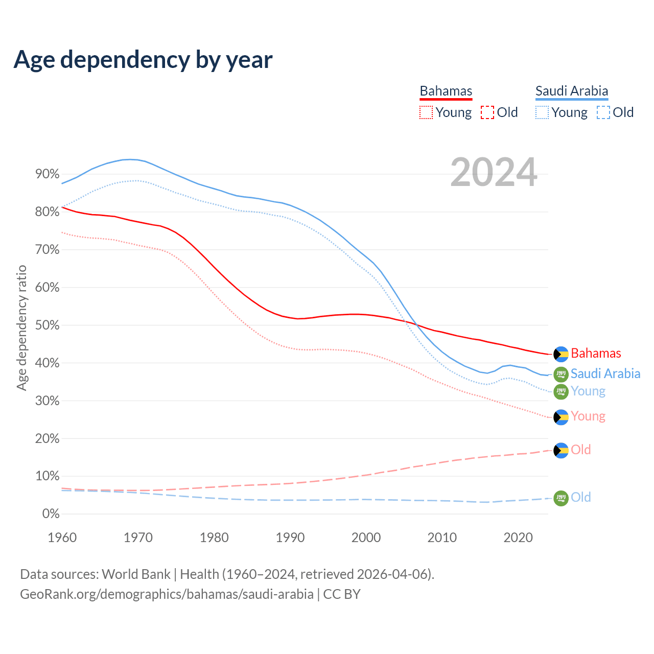 - The Bahamas is ranked 70/196 by median age (oldest to youngest) vs 98/196 for Saudi Arabia.