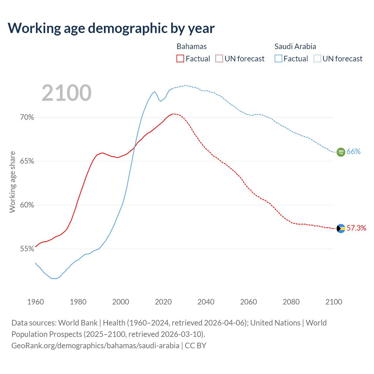 The share of older people aged 65 and over is 11.8% in the Bahamas and 2.95% in Saudi Arabia. Life expectancy in the Bahamas compared to Saudi Arabia .