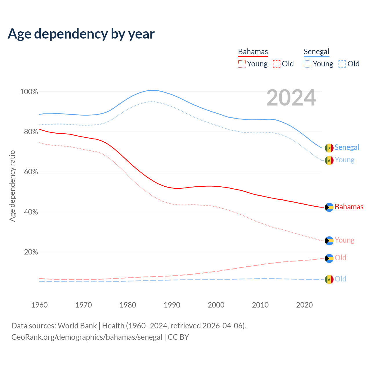 - The Bahamas is ranked 70/196 by median age (oldest to youngest) vs 162/196 for Senegal.