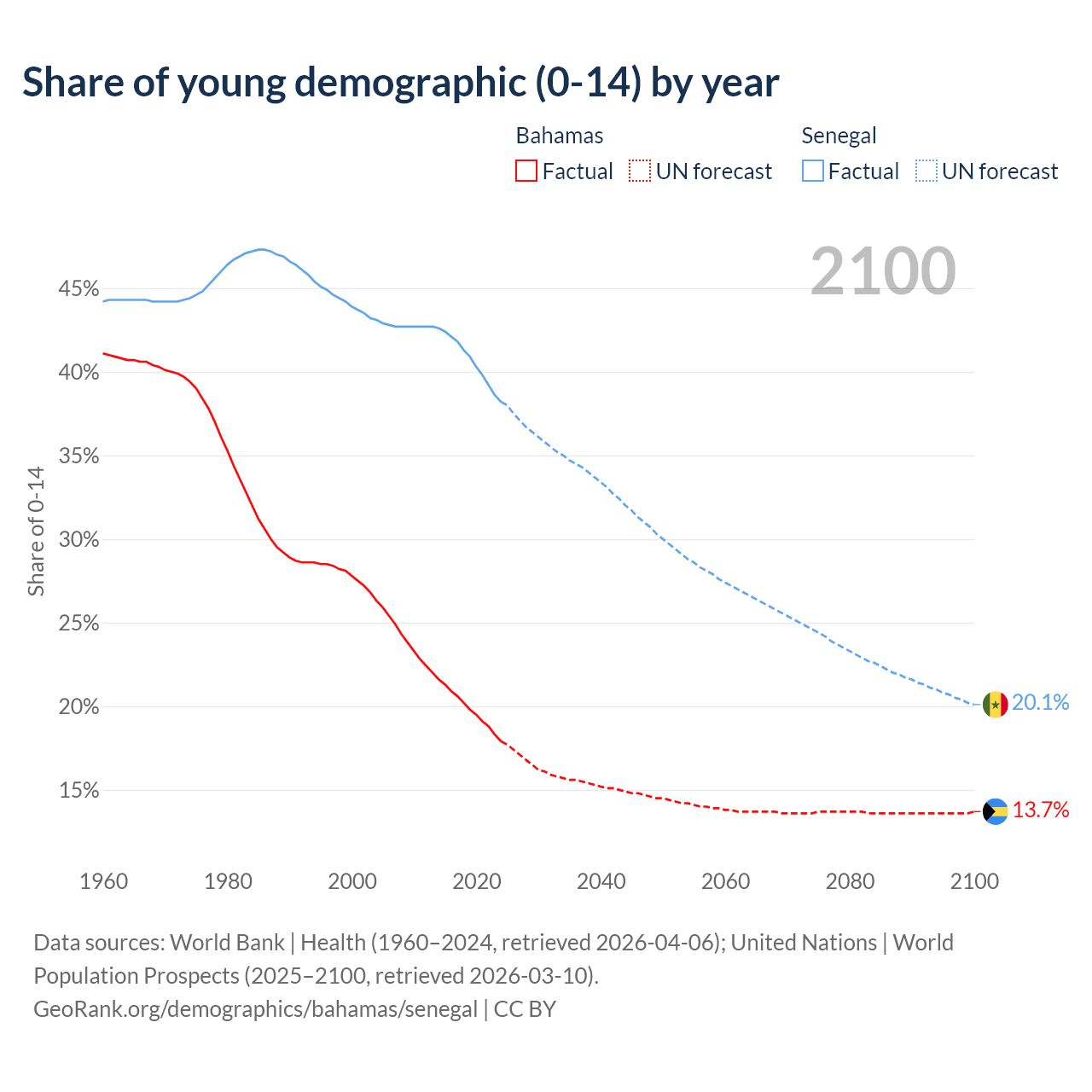 - The share of young demographic (0-15 years old) in the Bahamas is 17.9% vs 38.2% in Senegal.