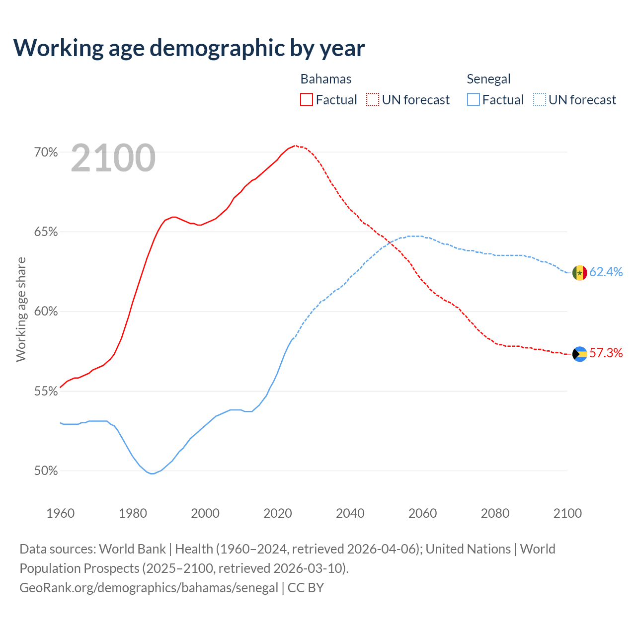 - The Bahamas has 285K working age adults (aged 15-64) vs 11.3M in Senegal.