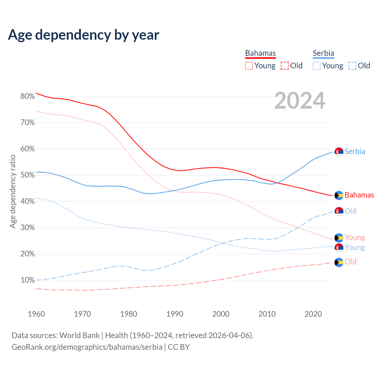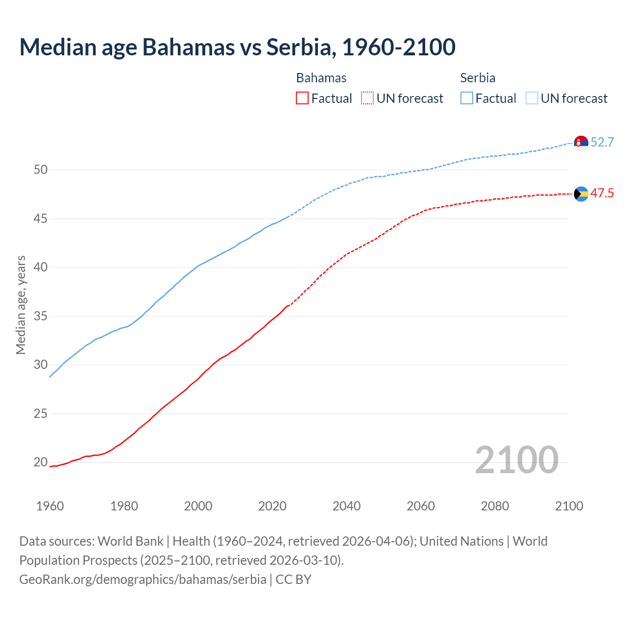 - The Bahamas is ranked 70/196 by median age (oldest to youngest) vs 15/196 for Serbia.