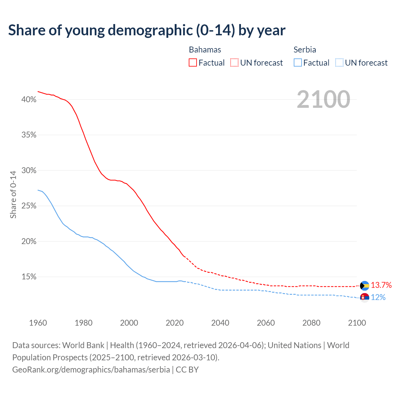 - The share of young demographic (0-15 years old) in the Bahamas is 17.9% vs 14.3% in Serbia.