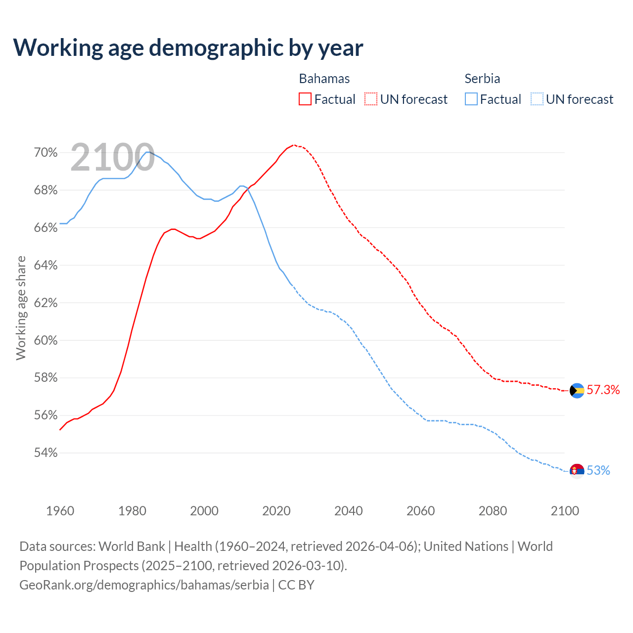 - The Bahamas has 285K working age adults (aged 15-64) vs 4.09M in Serbia.