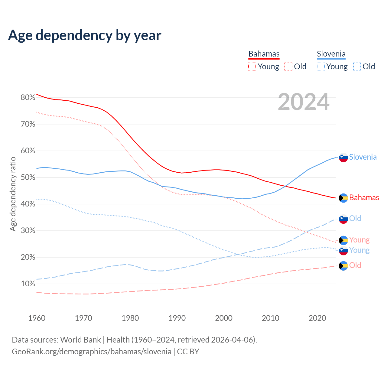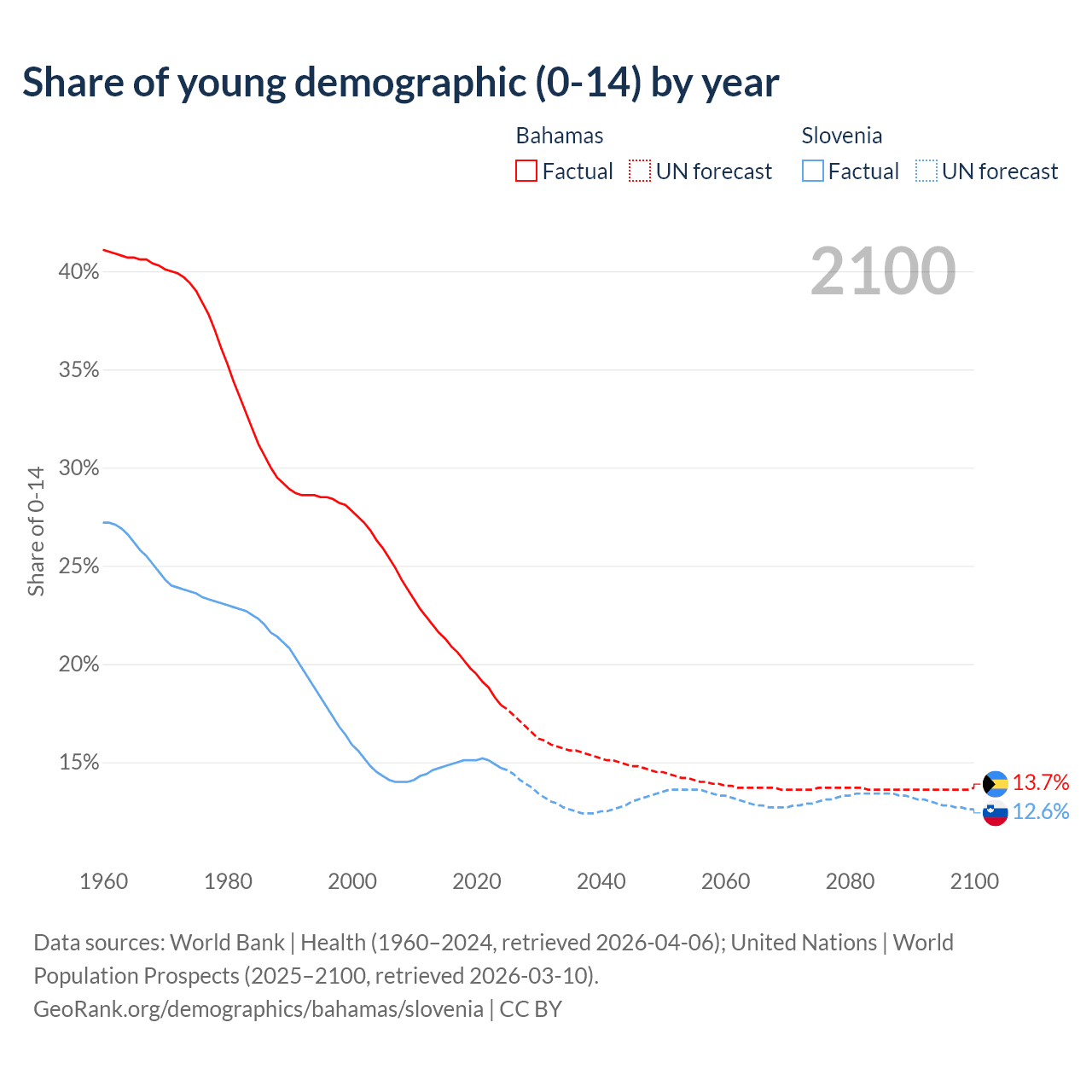 - The share of young demographic (0-15 years old) in the Bahamas is 17.9% vs 14.7% in Slovenia.