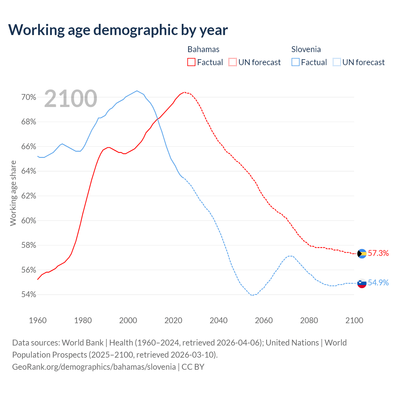 Median age Bahamas vs Slovenia, 1960-2100