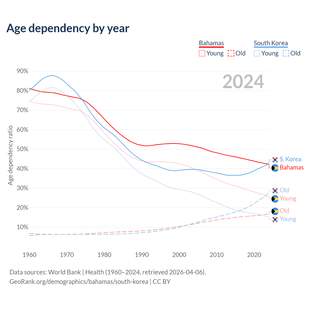 - The Bahamas is ranked 70/196 by median age (oldest to youngest) vs 10/196 for South Korea.