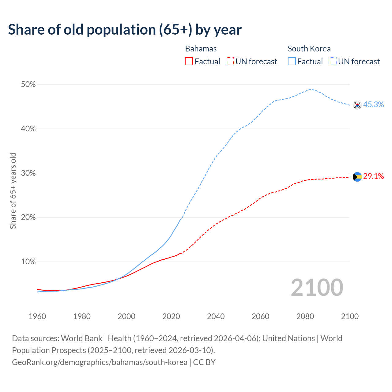 The share of older people aged 65 and over is 11.8% in the Bahamas and 19.3% in South Korea. Life expectancy in the Bahamas compared to South Korea .