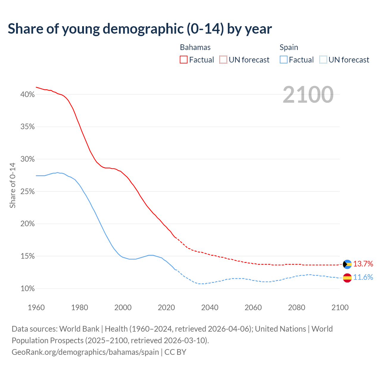 - The share of young demographic (0-15 years old) in the Bahamas is 17.9% vs 12.9% in Spain.