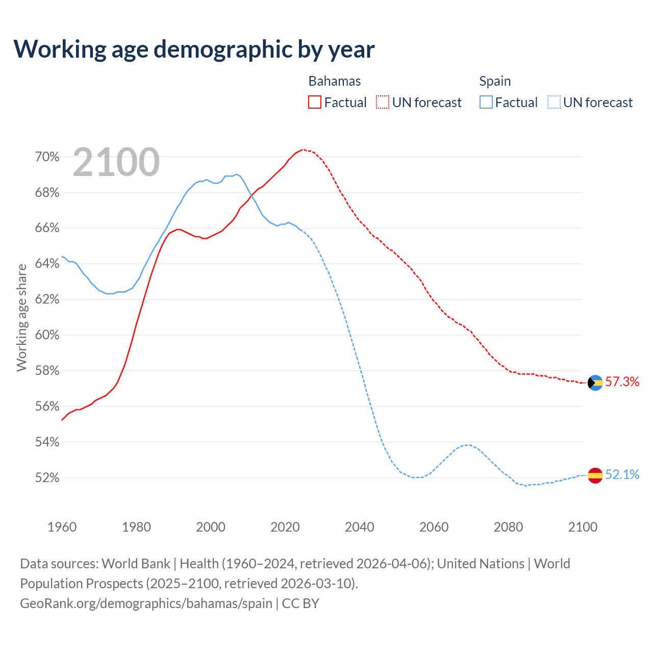 - The Bahamas is ranked 70/196 by median age (oldest to youngest) vs 7/196 for Spain.
