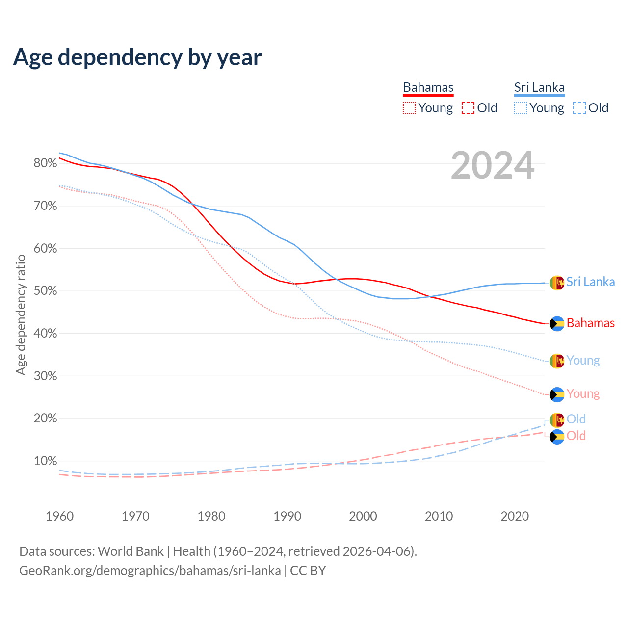 - The Bahamas is ranked 70/196 by median age (oldest to youngest) vs 81/196 for Sri Lanka.