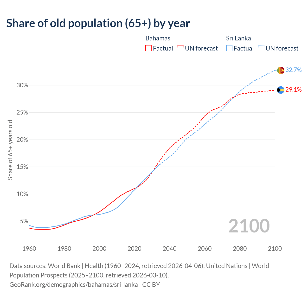 The share of older people aged 65 and over is 11.8% in the Bahamas and 12.1% in Sri Lanka. Life expectancy in the Bahamas compared to Sri Lanka .