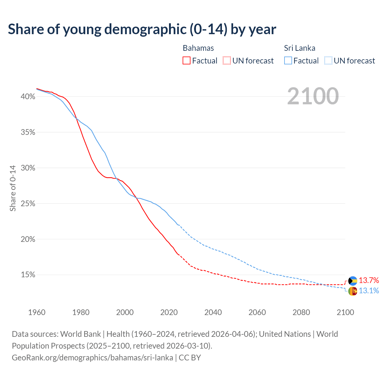 - The share of young demographic (0-15 years old) in the Bahamas is 17.9% vs 22% in Sri Lanka.