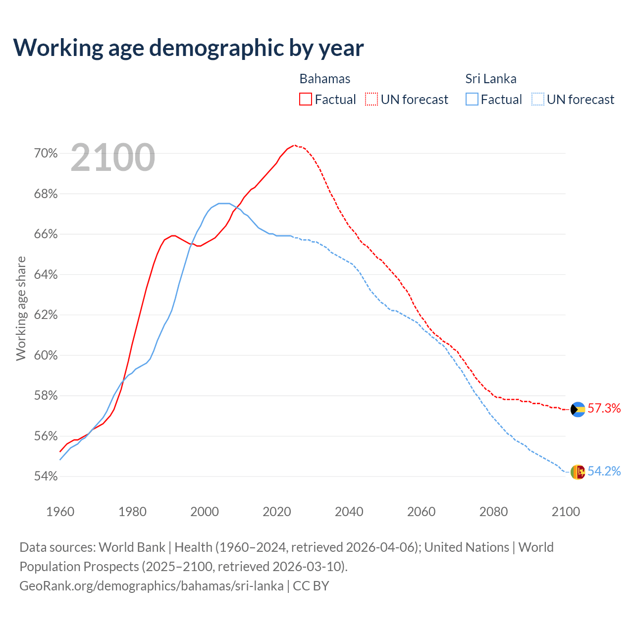 Median age Bahamas vs Sri Lanka, 1960-2100