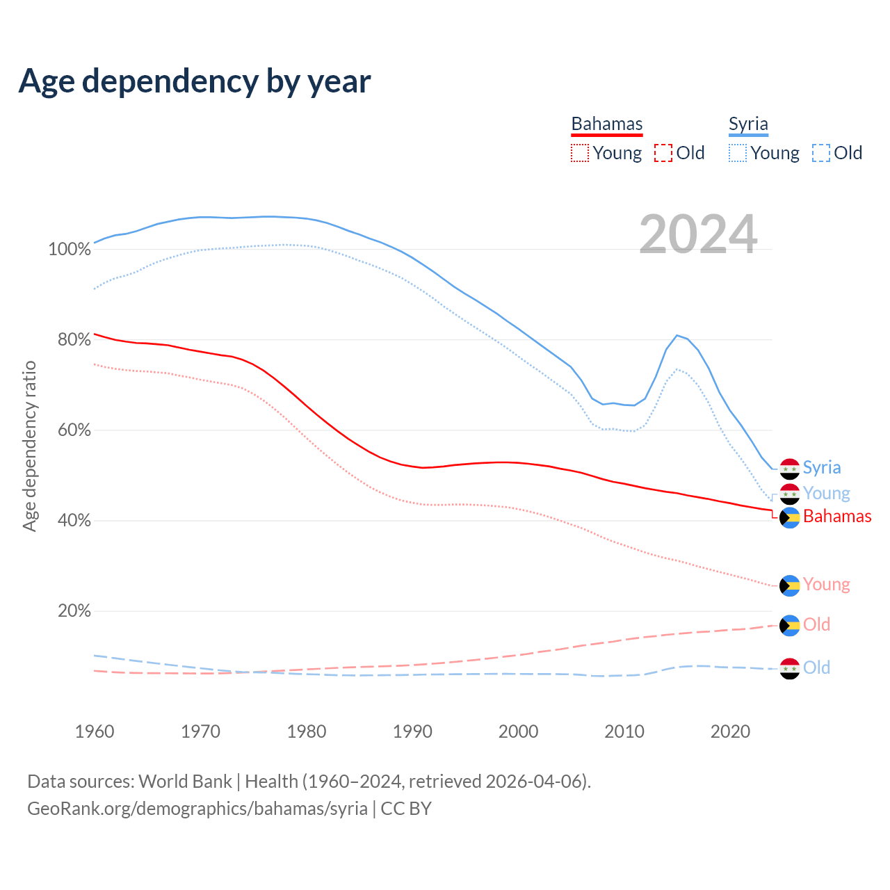 - The share of old-age demographic (65+) in the Bahamas is 11.8% vs 4.74% in Syria.