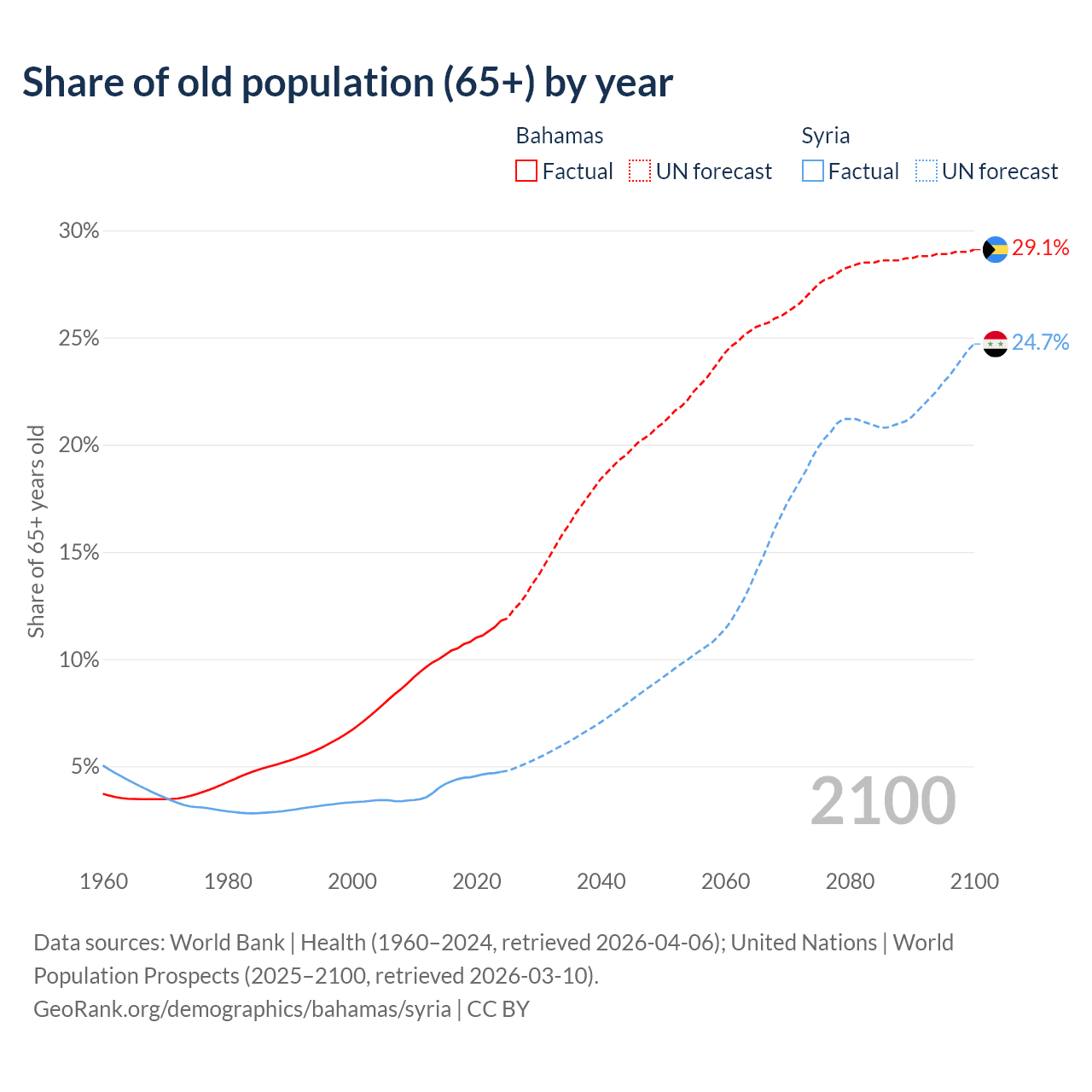 The share of older people aged 65 and over is 11.8% in the Bahamas and 4.74% in Syria. Life expectancy in the Bahamas compared to Syria .