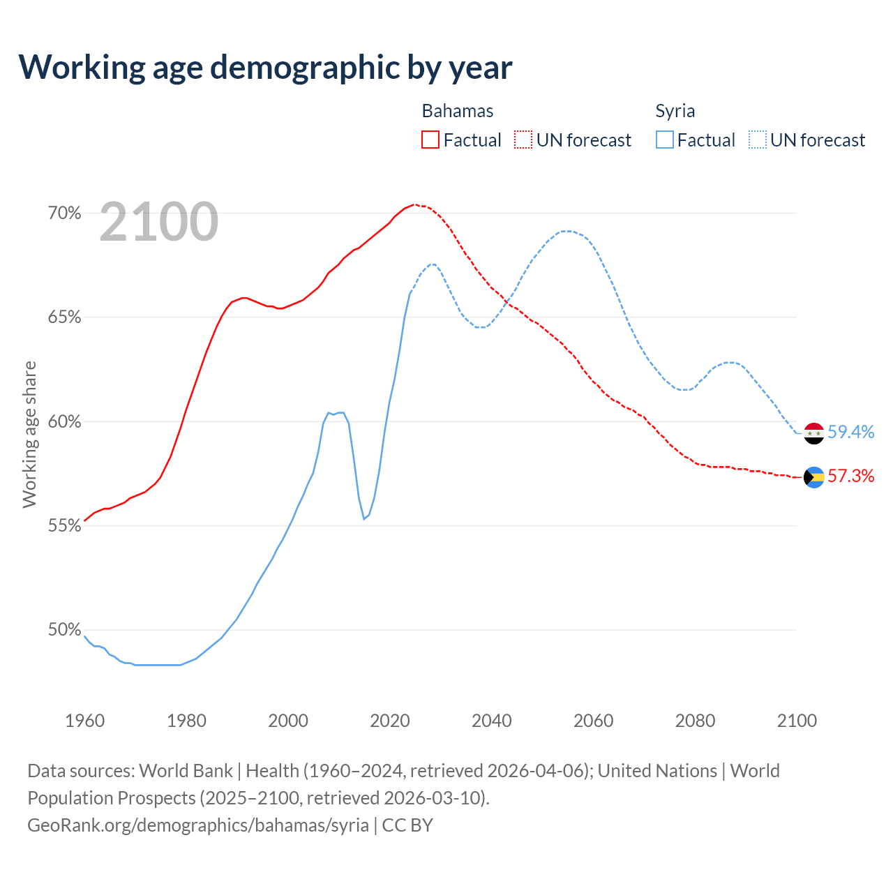 - The Bahamas has 285K working age adults (aged 15-64) vs 17.7M in Syria.