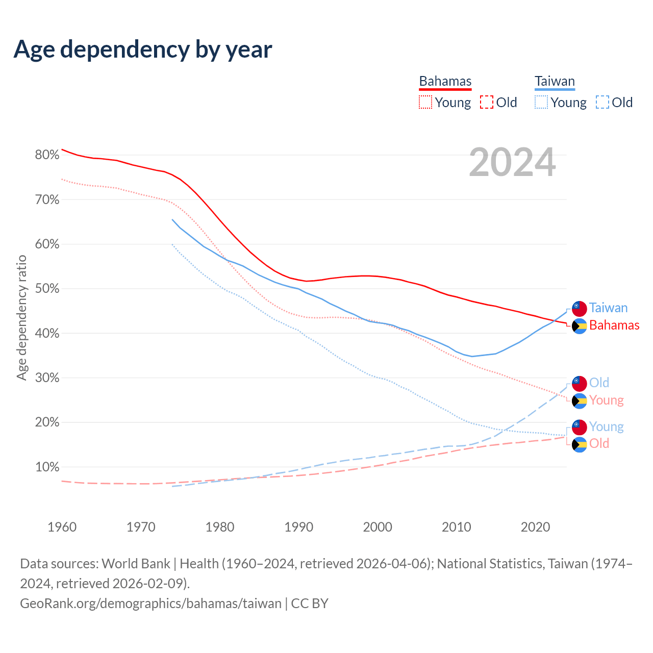 Data sources: World Bank | Health (1960–2024, retrieved 2026-04-06); U.S. Census Bureau (1960–2024, retrieved 2026-02-08); National Statistics, Taiwan (1974–2024, retrieved 2026-02-09).