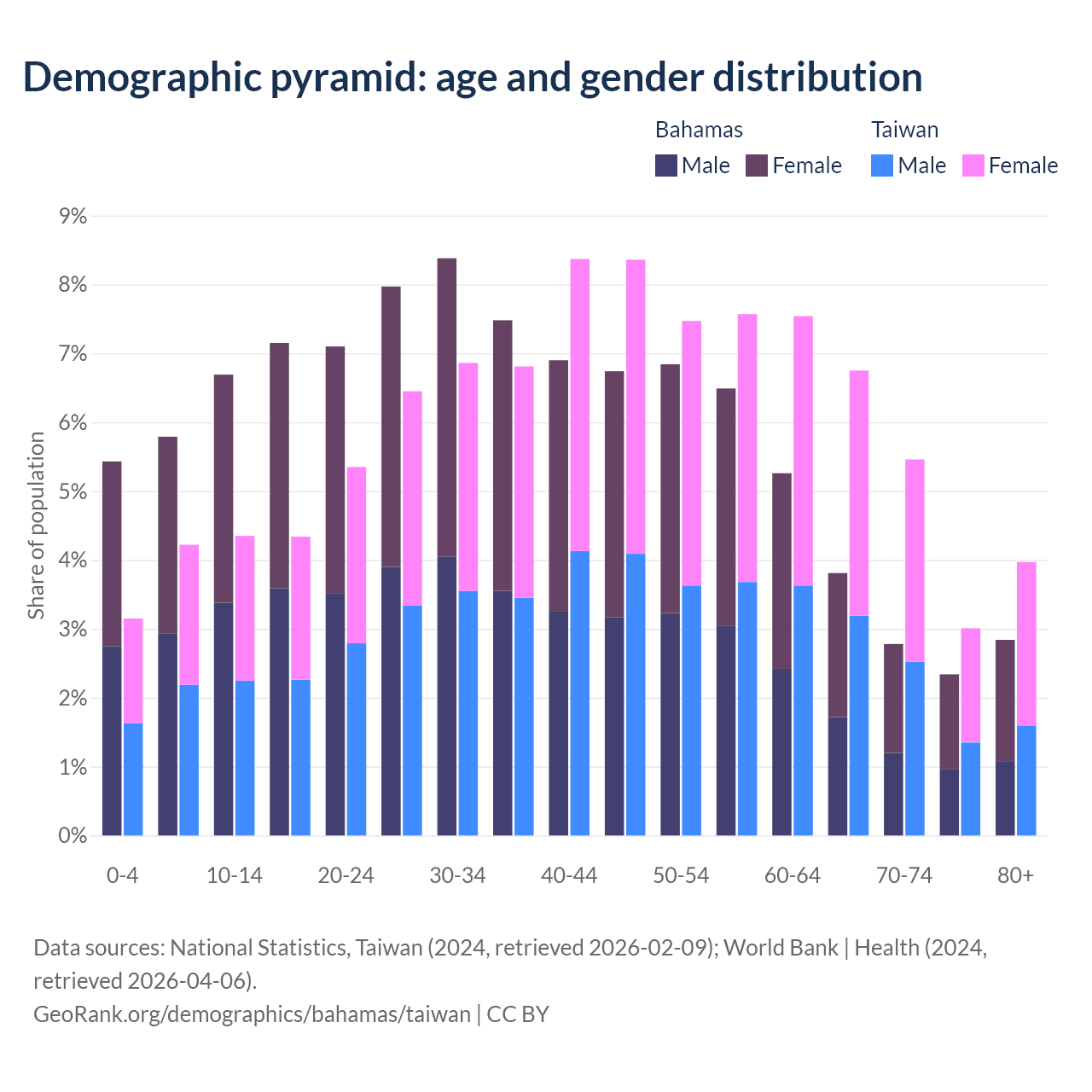 - The Bahamas is ranked 70/196 by median age (oldest to youngest) vs 16/196 for Taiwan.