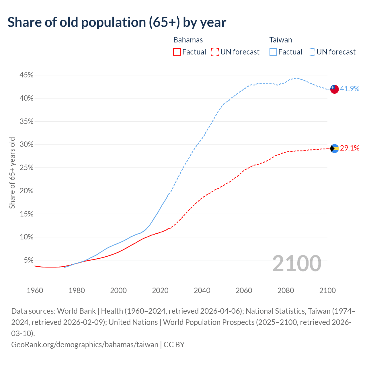 The share of older people aged 65 and over is 11.8% in the Bahamas and 19.2% in Taiwan. Life expectancy in the Bahamas compared to Taiwan .