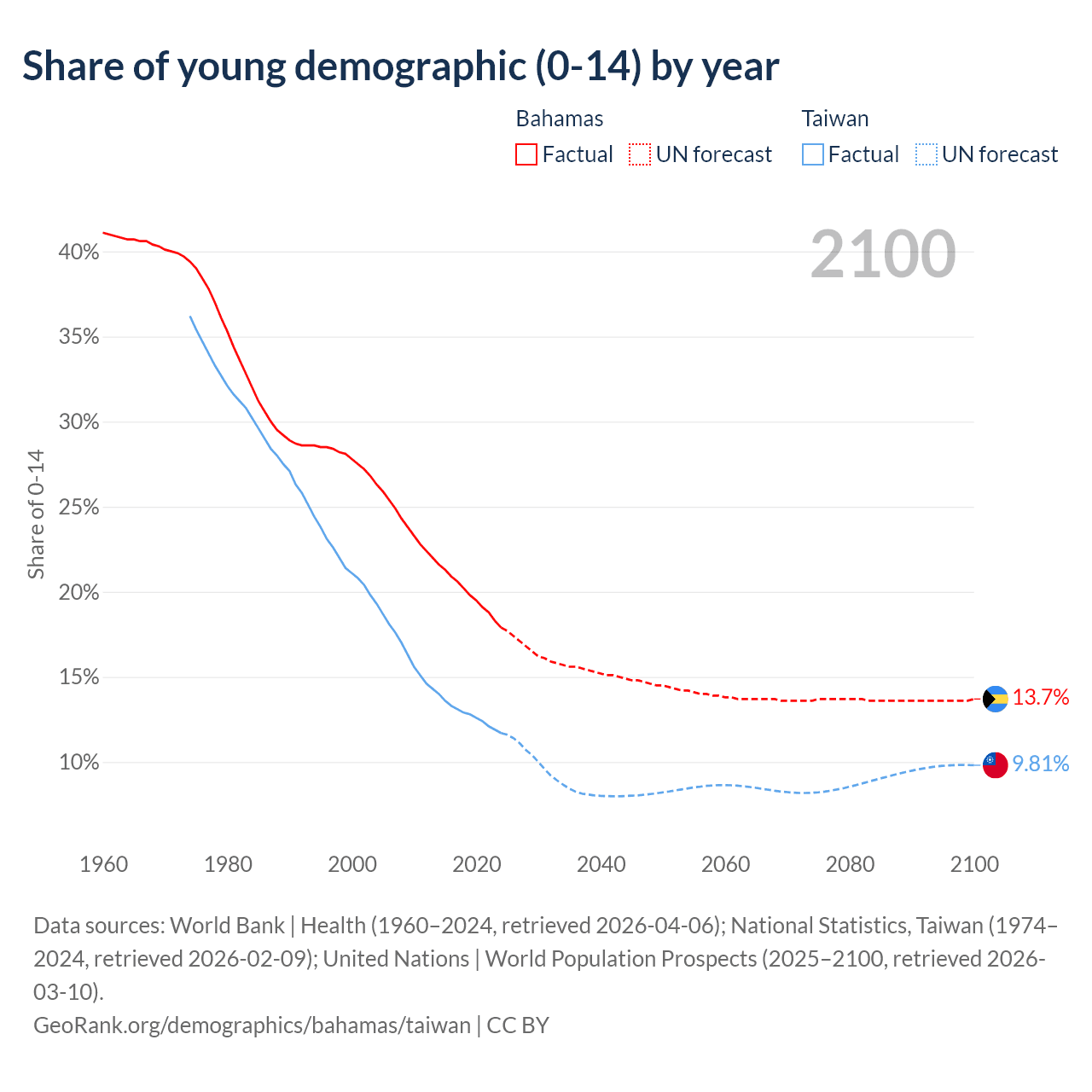 - The share of young demographic (0-15 years old) in the Bahamas is 17.9% vs 11.7% in Taiwan.
