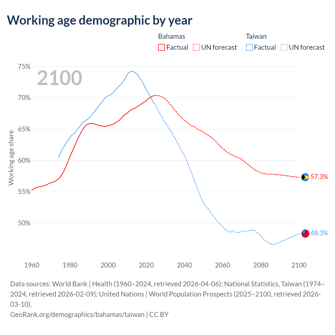 - The Bahamas has 285K working age adults (aged 15-64) vs 16.1M in Taiwan.
