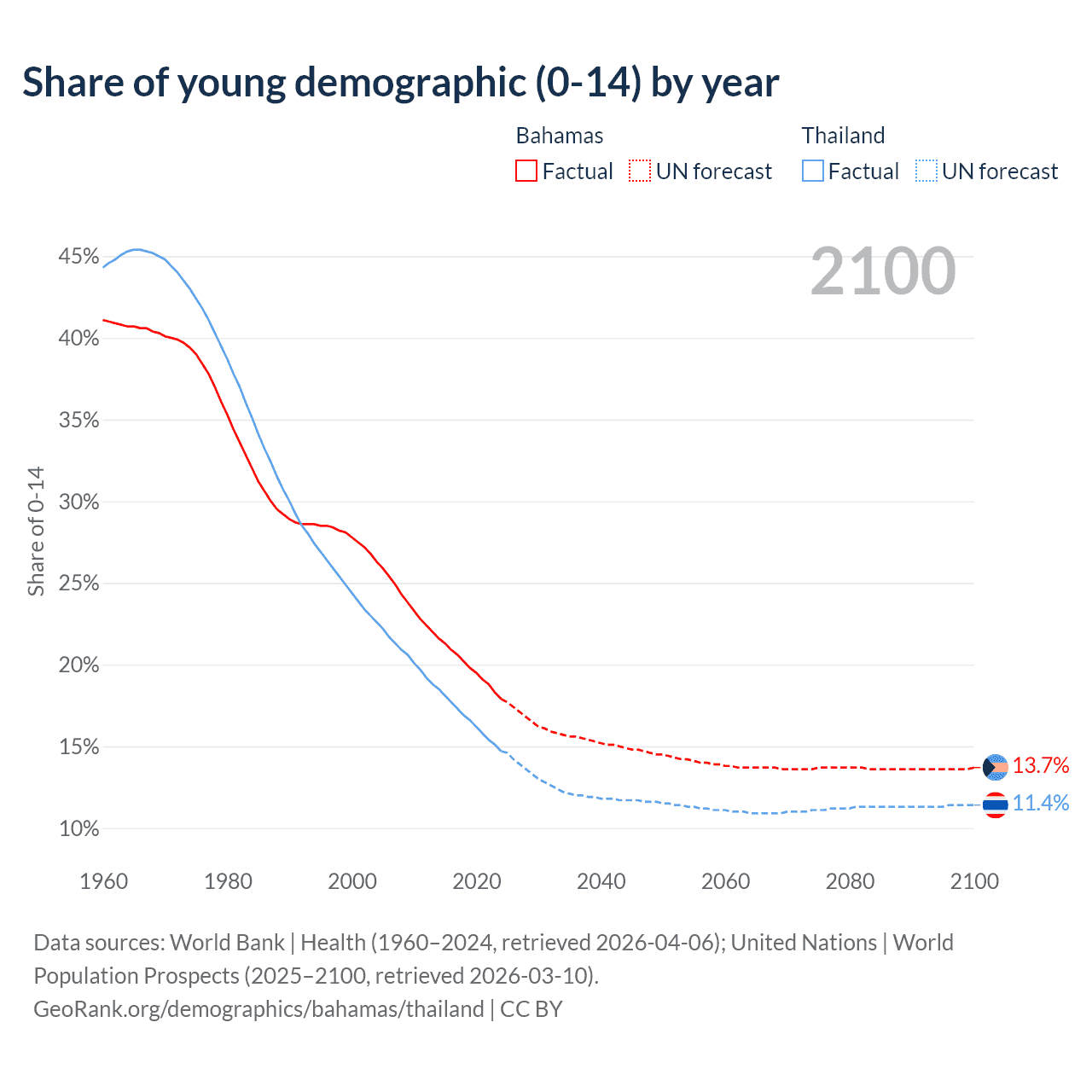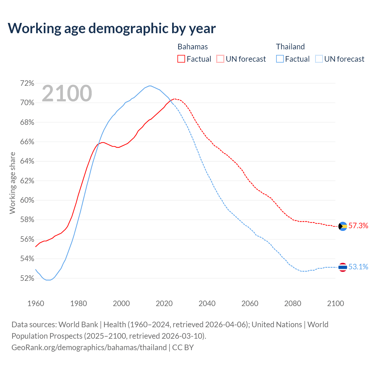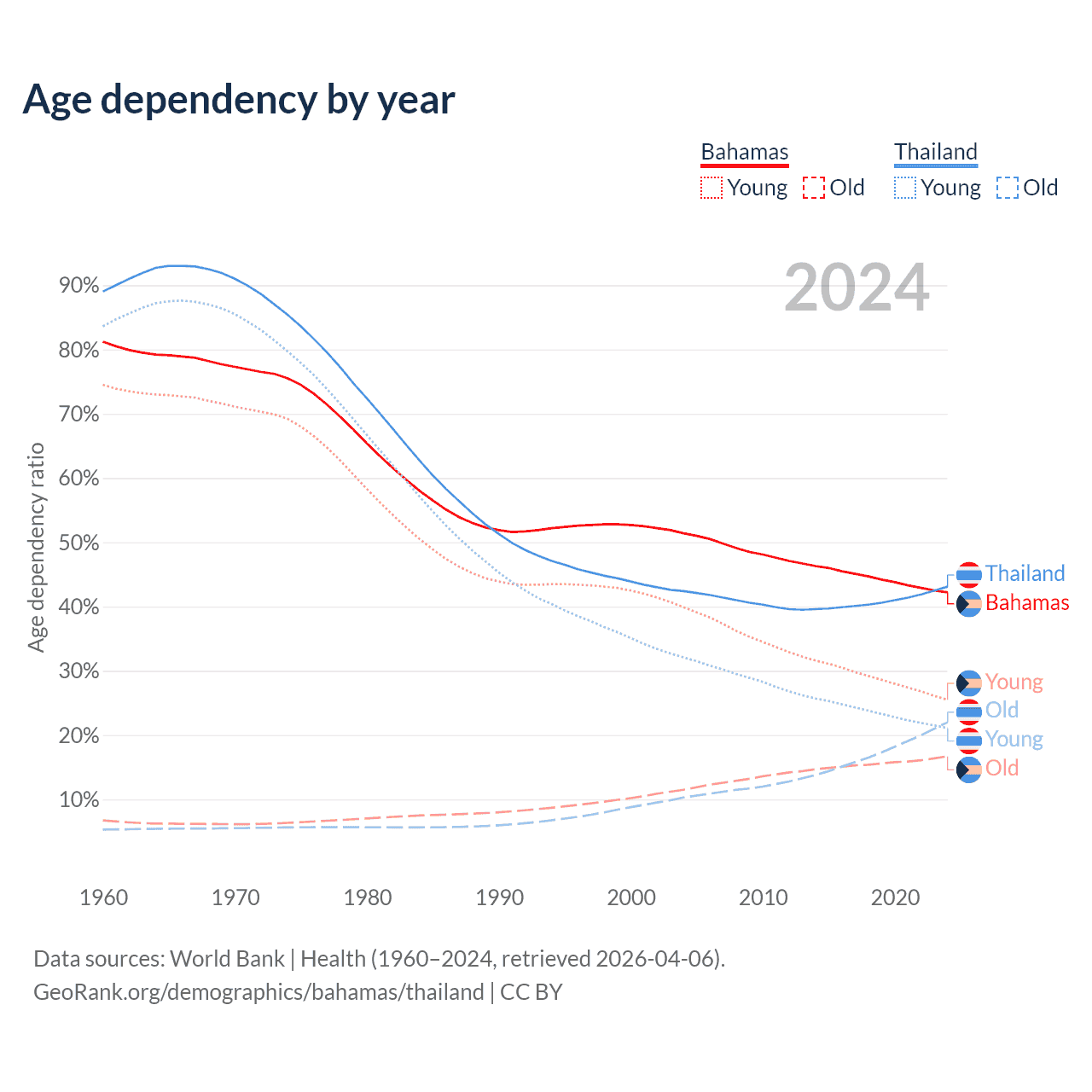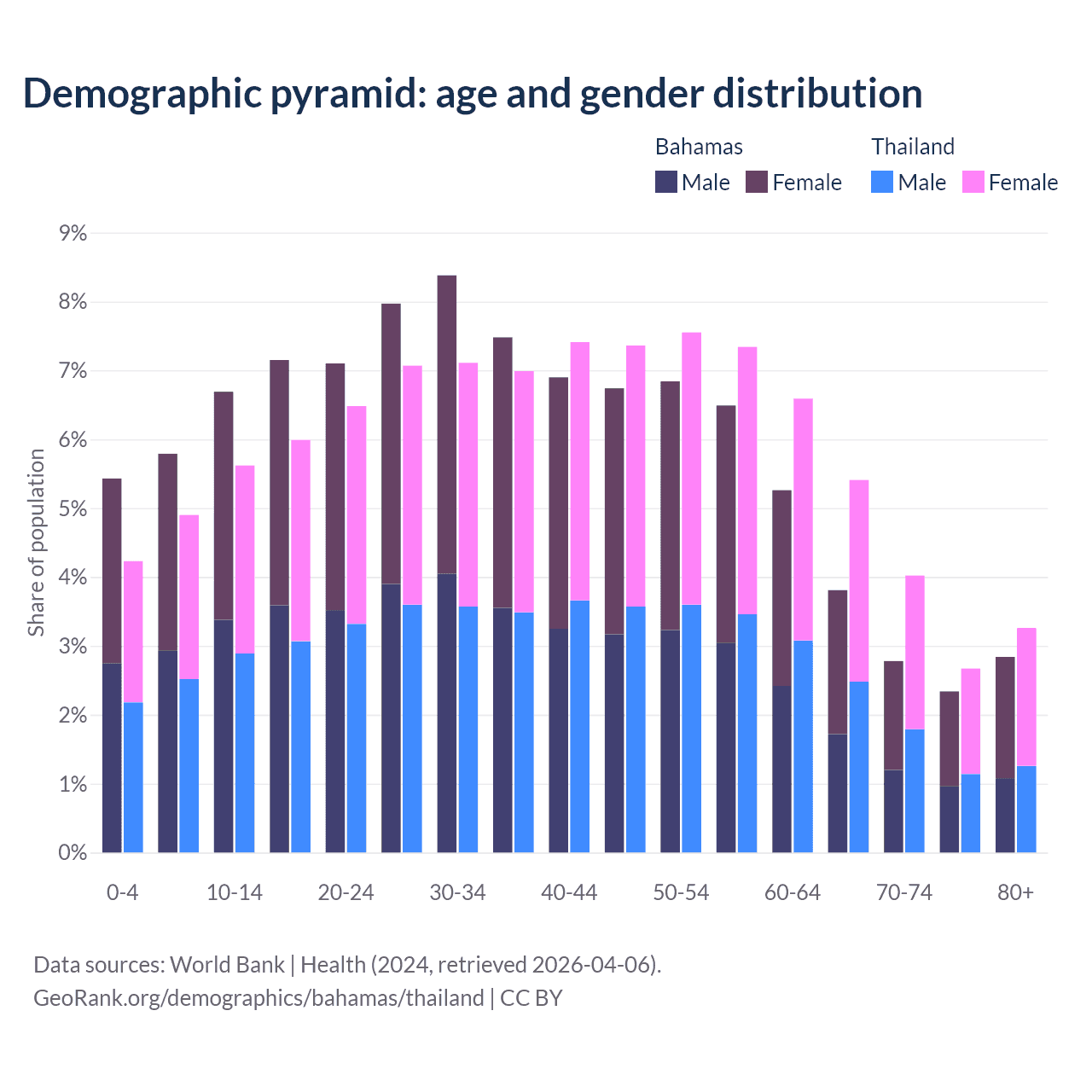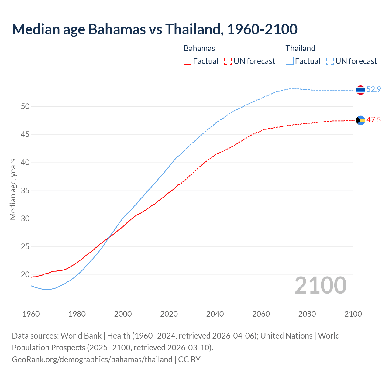 - The Bahamas is ranked 70/196 by median age (oldest to youngest) vs 40/196 for Thailand.