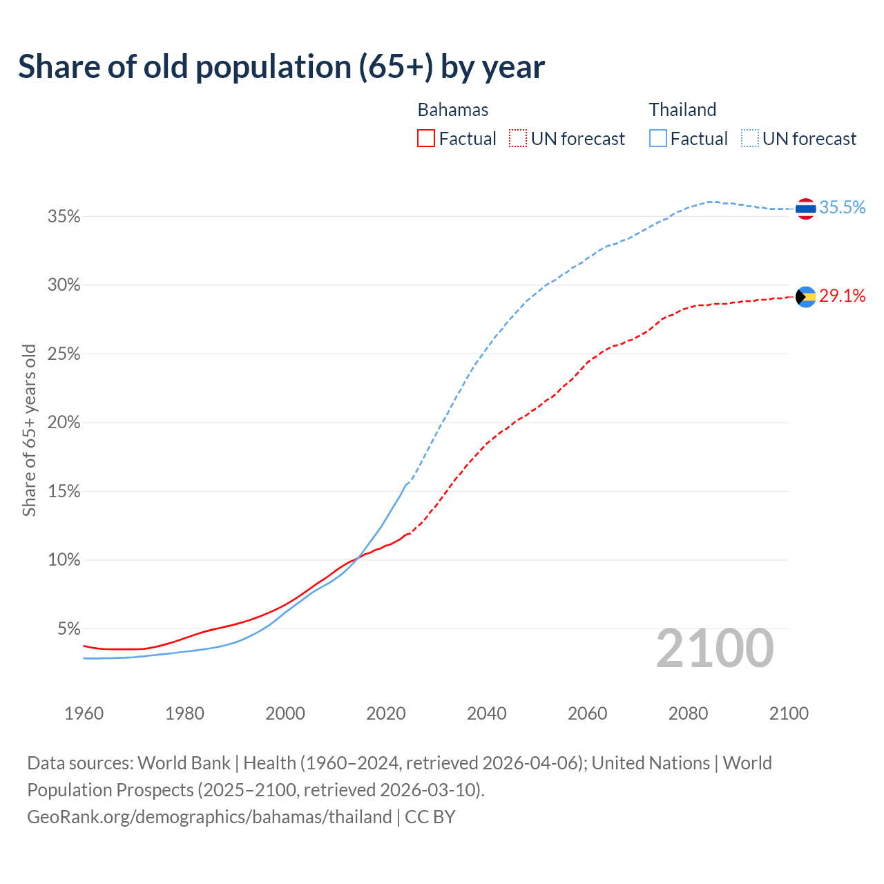 The share of older people aged 65 and over is 11.8% in the Bahamas and 15.4% in Thailand. Life expectancy in the Bahamas compared to Thailand .