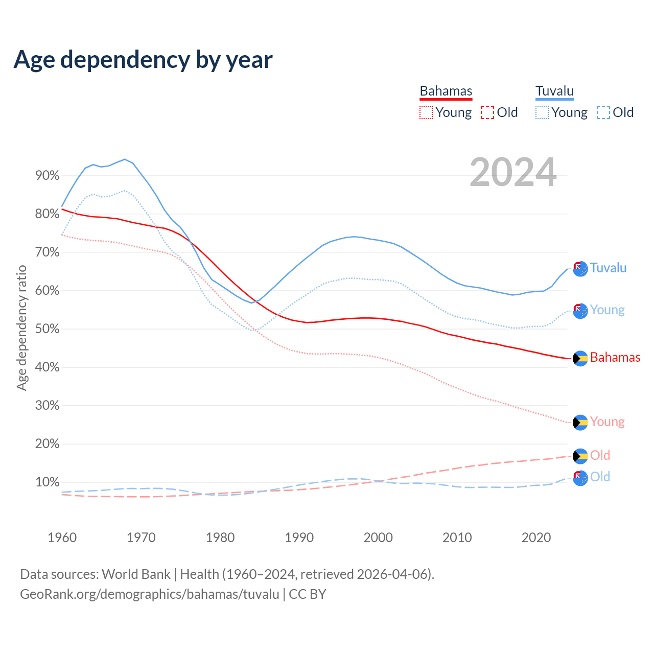 - The share of old-age demographic (65+) in the Bahamas is 11.8% vs 6.67% in Tuvalu.