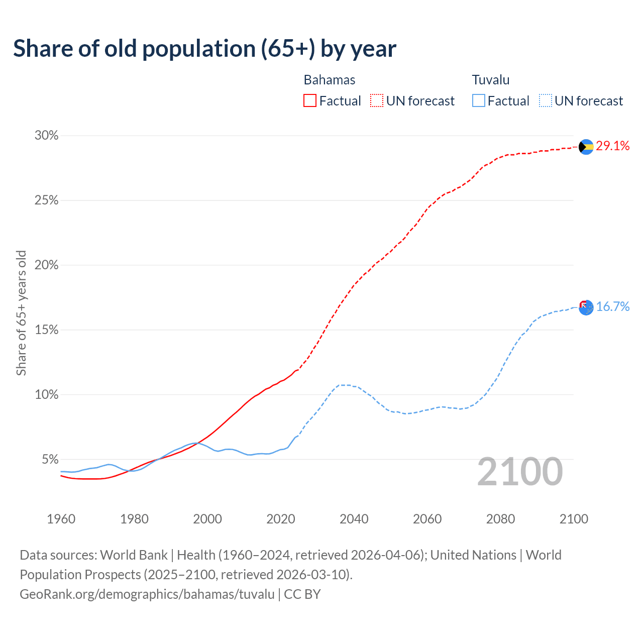 The share of older people aged 65 and over is 11.8% in the Bahamas and 6.67% in Tuvalu. Life expectancy in the Bahamas compared to Tuvalu .