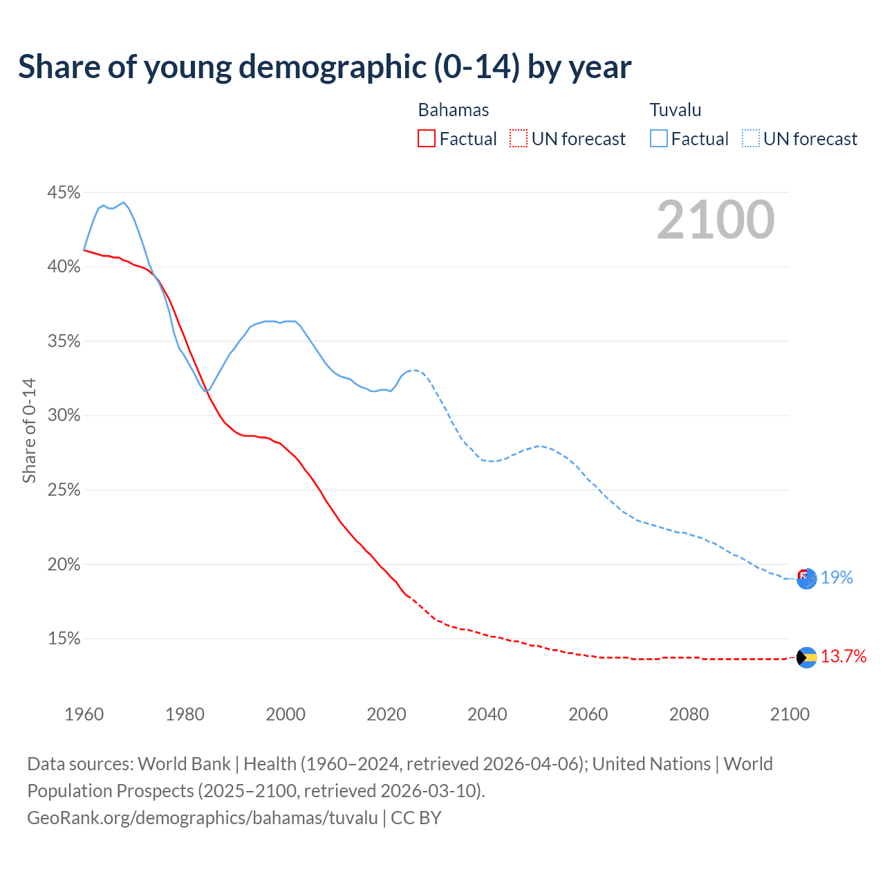 - The share of young demographic (0-15 years old) in the Bahamas is 17.9% vs 32.9% in Tuvalu.