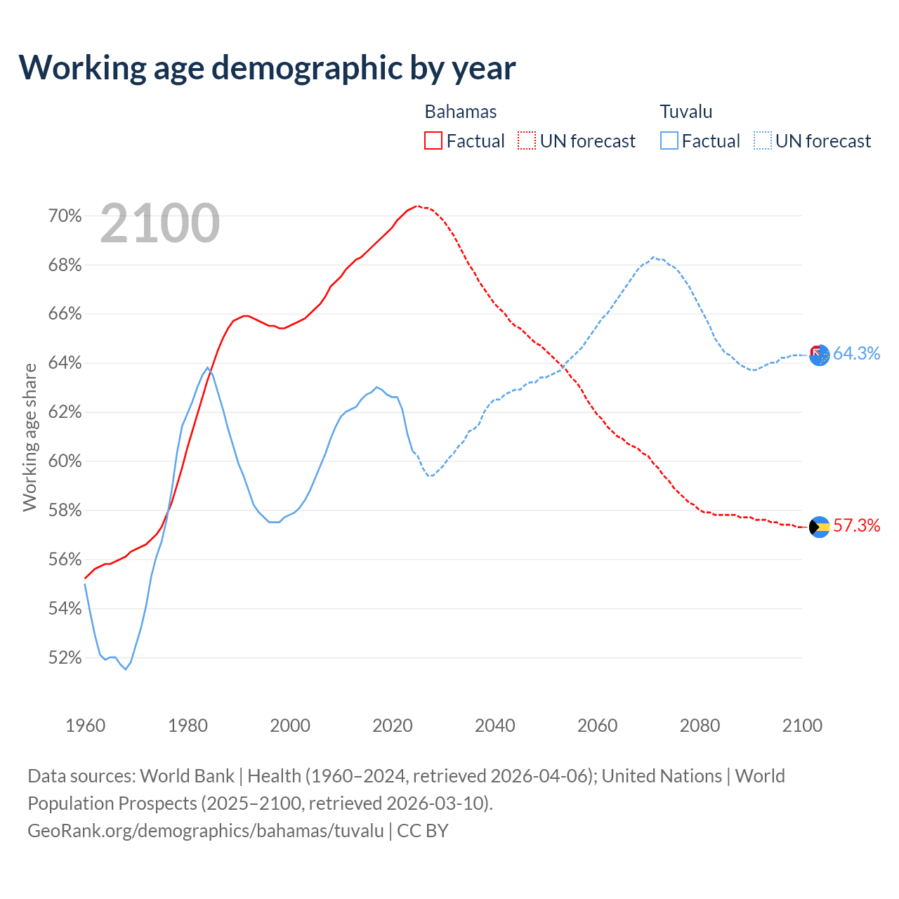 - The Bahamas has 285K working age adults (aged 15-64) vs 5.64K in Tuvalu.