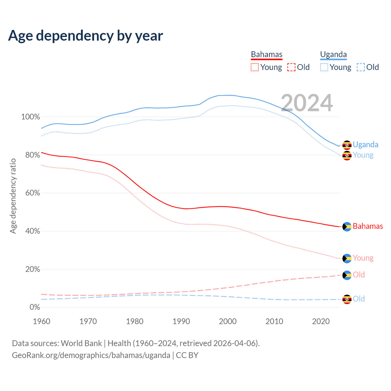 - The share of old-age demographic (65+) in the Bahamas is 11.8% vs 2.19% in Uganda.