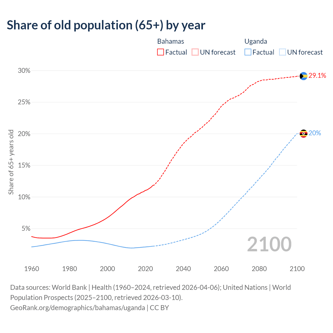The share of older people aged 65 and over is 11.8% in the Bahamas and 2.19% in Uganda. Life expectancy in the Bahamas compared to Uganda .