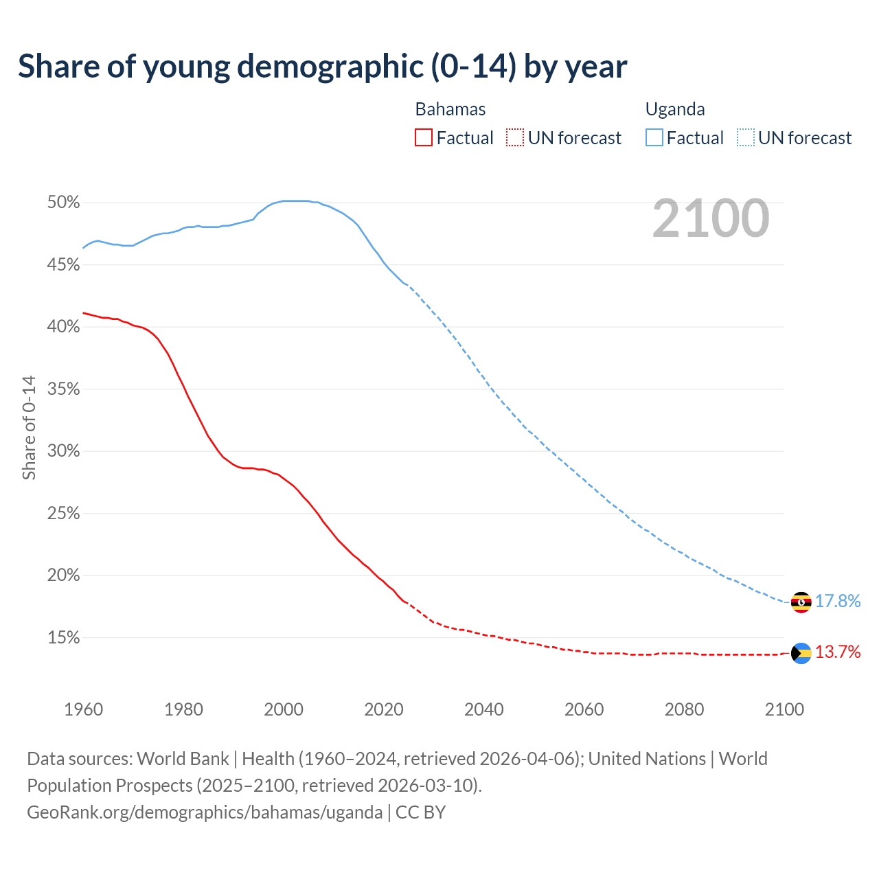 - The share of young demographic (0-15 years old) in the Bahamas is 17.9% vs 43.5% in Uganda.
