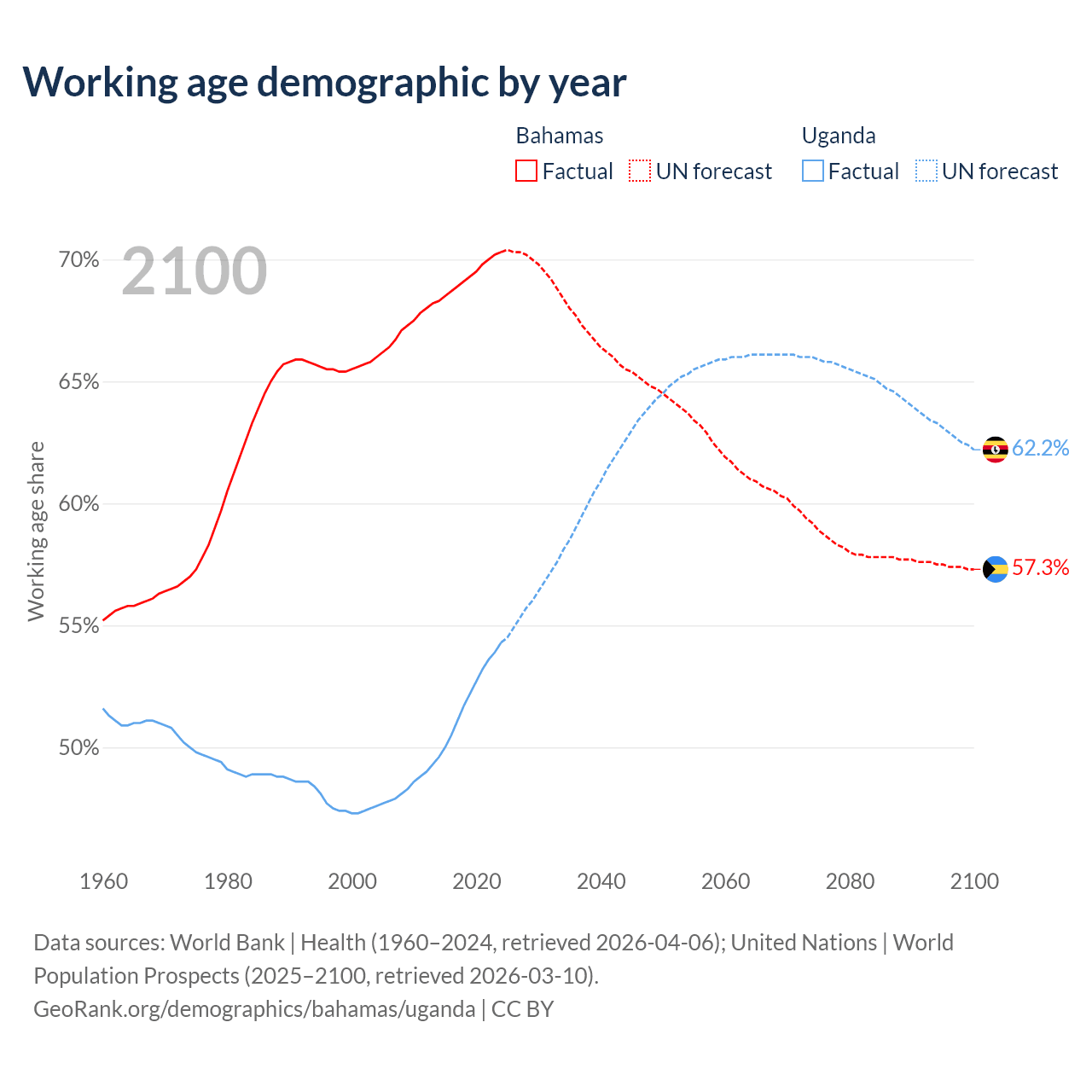 Median age Bahamas vs Uganda, 1960-2100