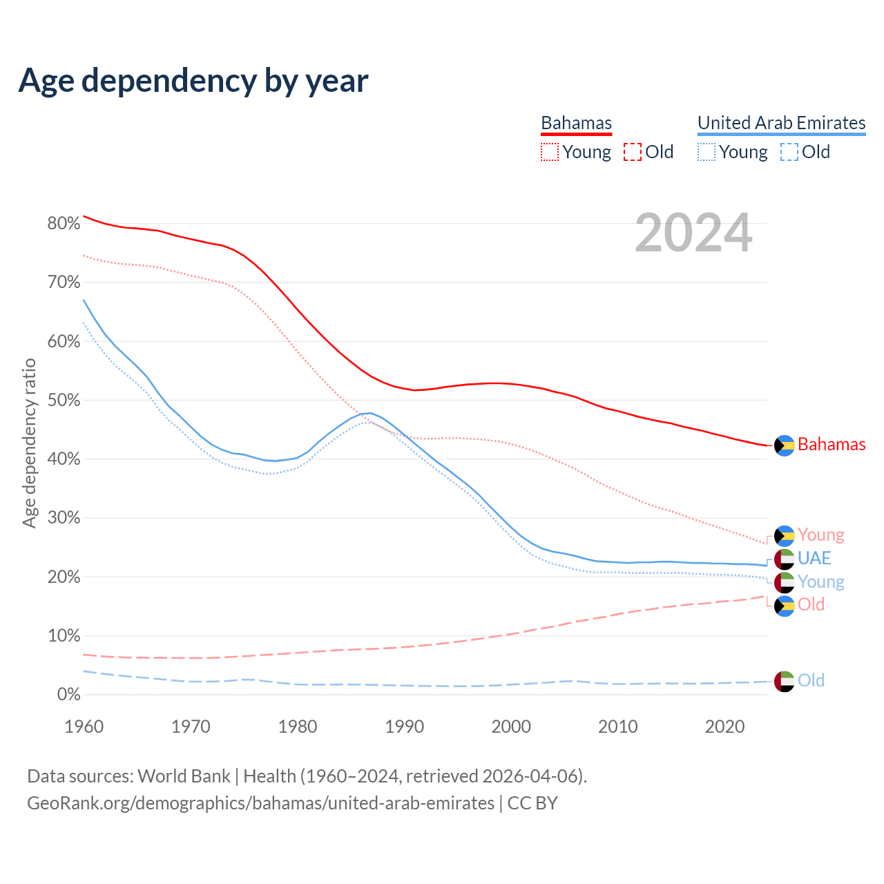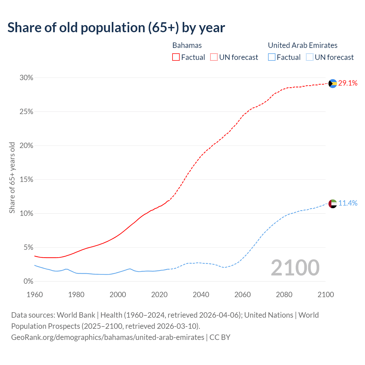 The share of older people aged 65 and over is 11.8% in the Bahamas and 1.77% in the United Arab Emirates. Life expectancy in the Bahamas compared to the United Arab Emirates .