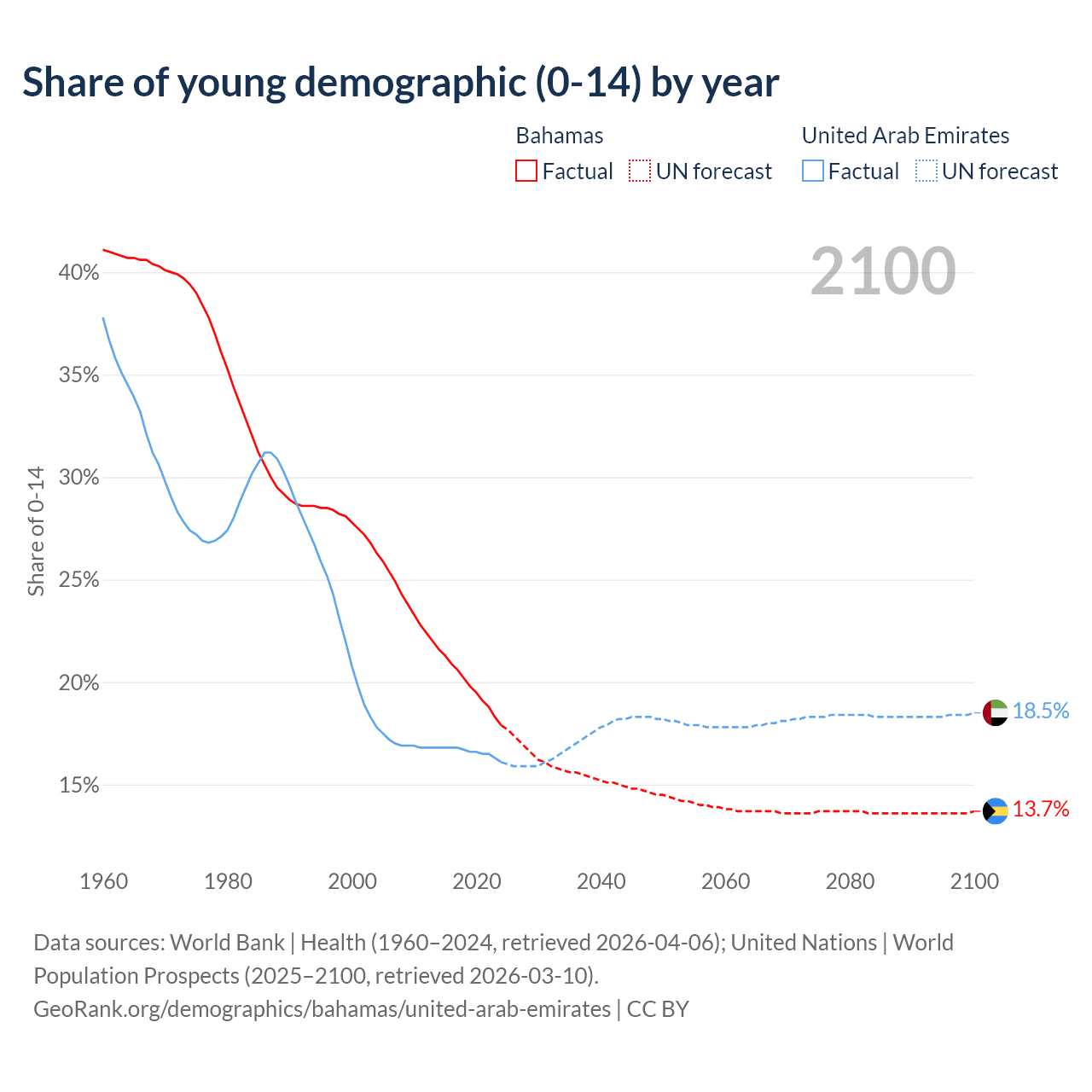 - The share of young demographic (0-15 years old) in the Bahamas is 17.9% vs 16.1% in the United Arab Emirates.