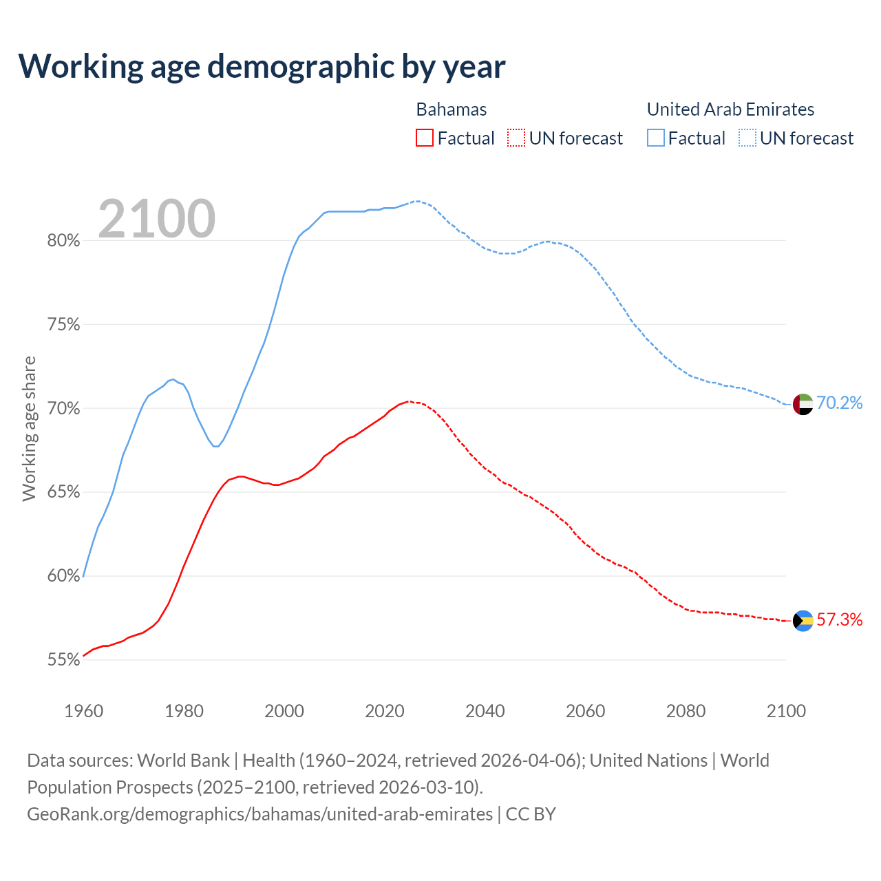 - The Bahamas has 285K working age adults (aged 15-64) vs 9.6M in the United Arab Emirates.