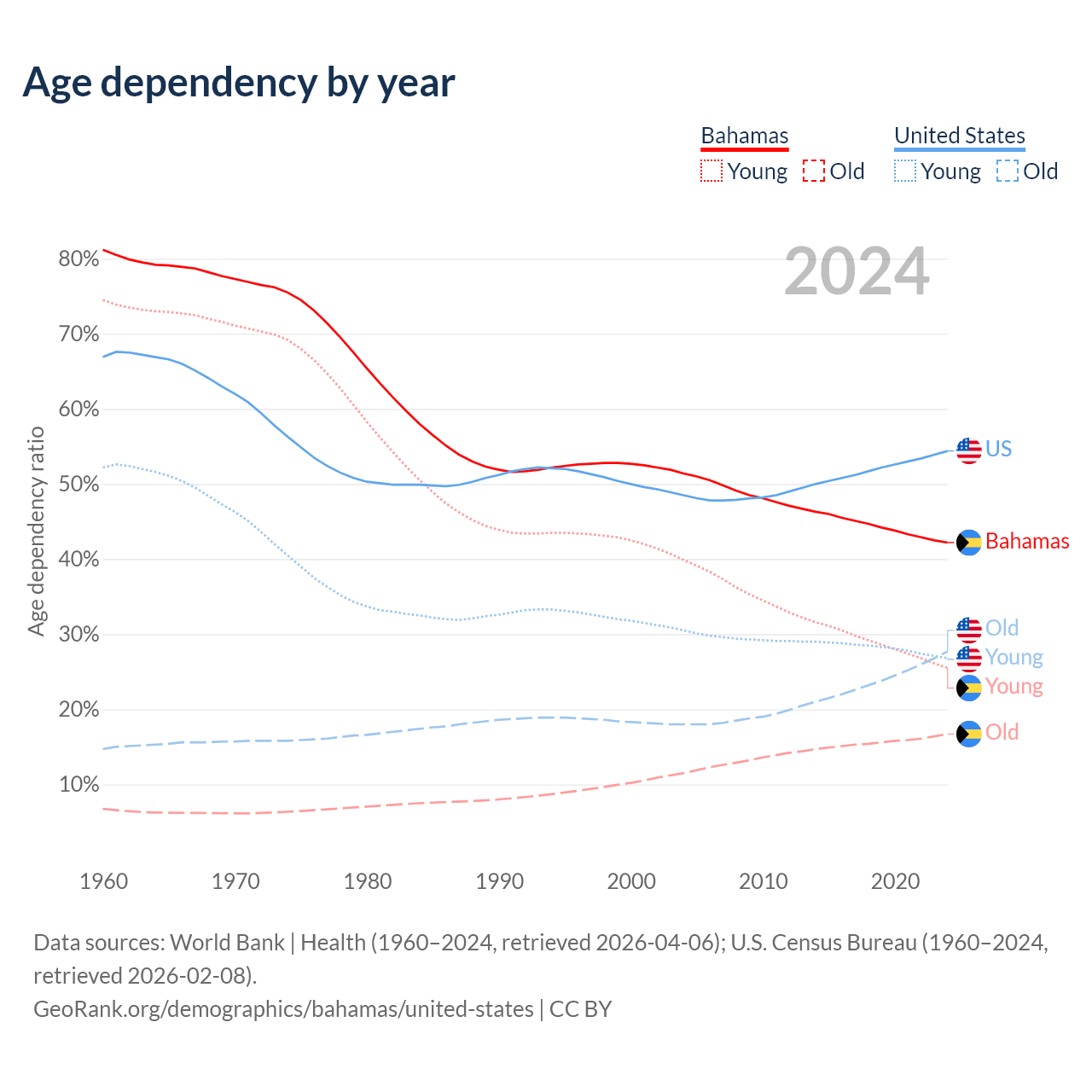The share of older people aged 65 and over is 11.8% in the Bahamas and 17.9% in the United States. Life expectancy in the Bahamas compared to the United States .