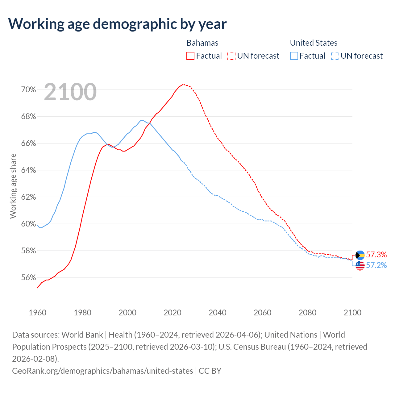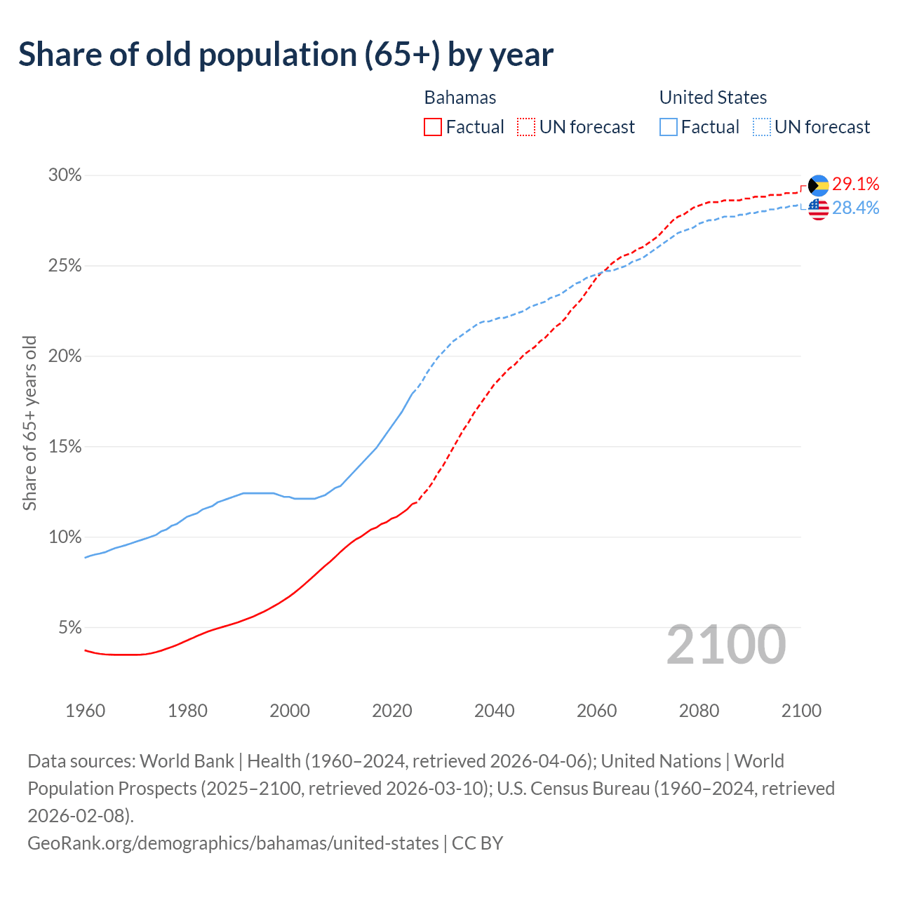 Median age Bahamas vs United States, 1960-2100