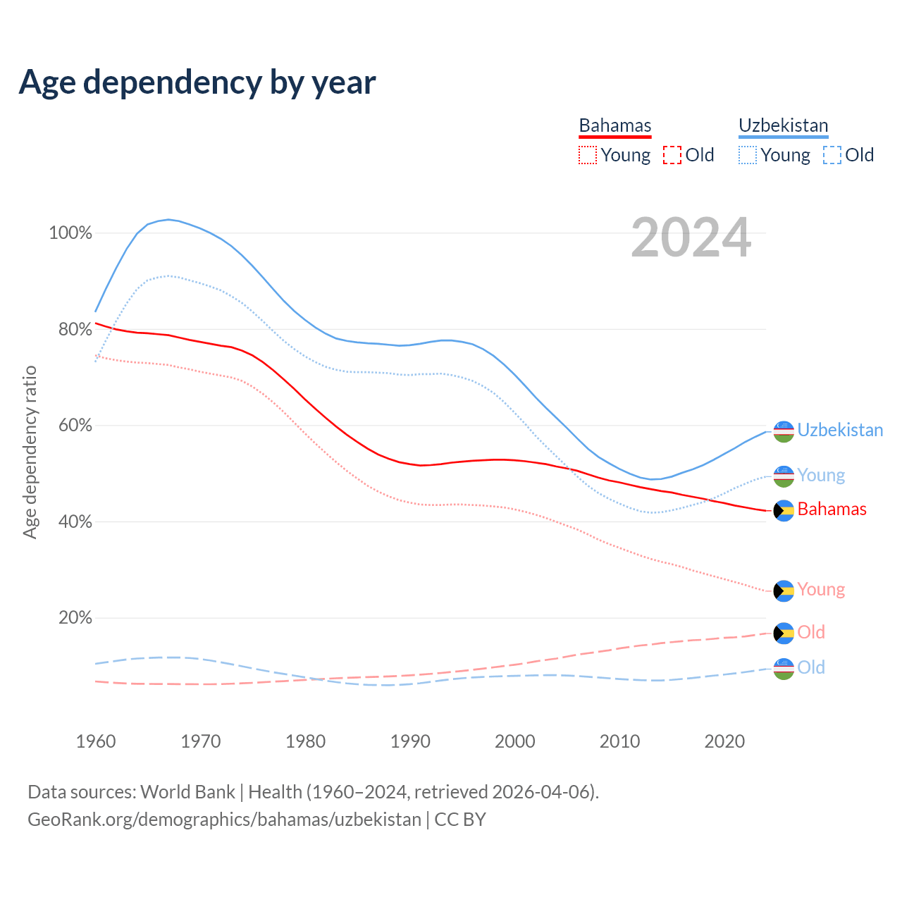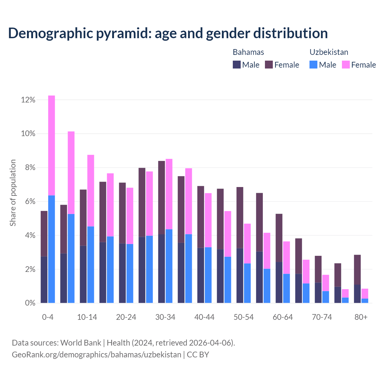 - The share of old-age demographic (65+) in the Bahamas is 11.8% vs 5.86% in Uzbekistan.