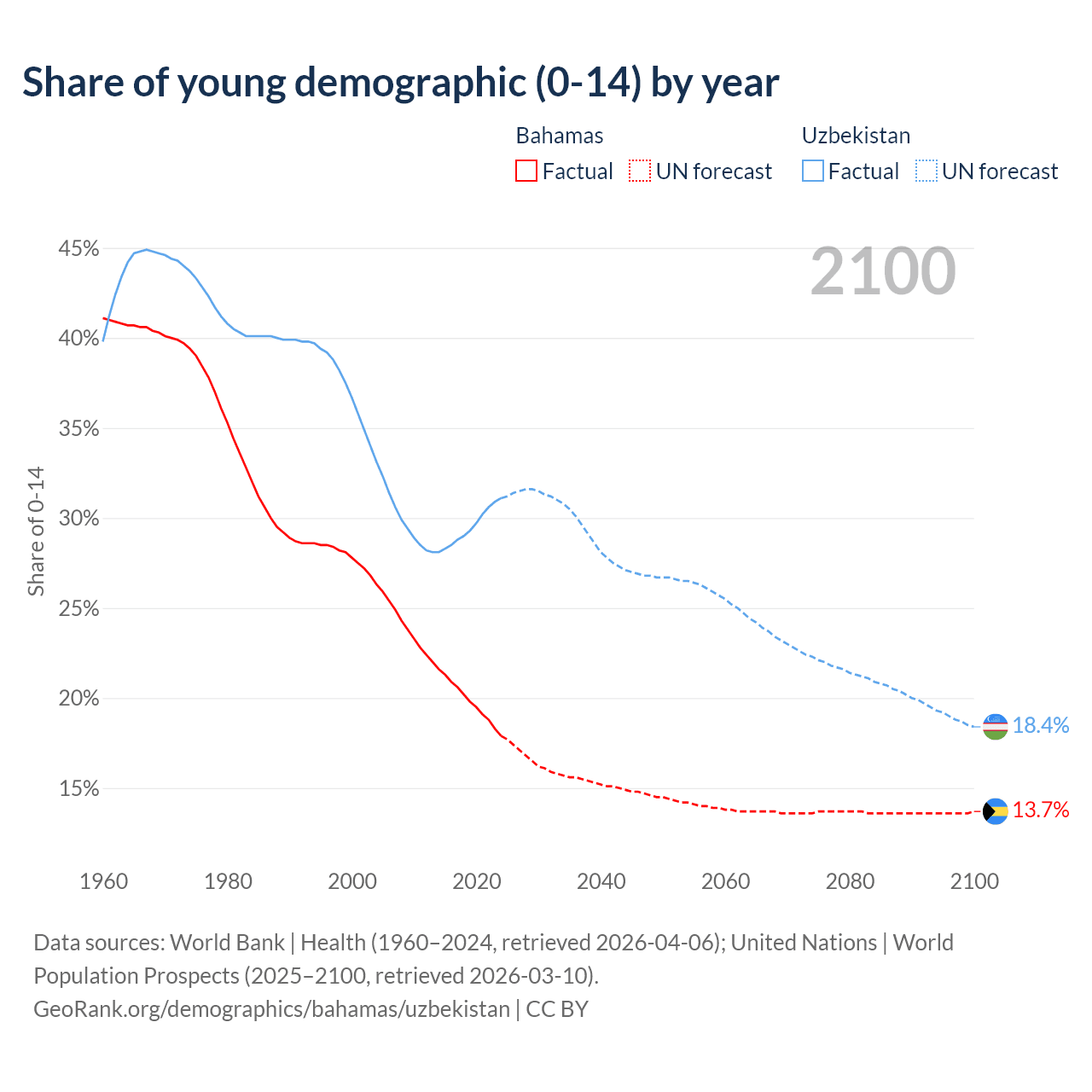 - The share of young demographic (0-15 years old) in the Bahamas is 17.9% vs 31.1% in Uzbekistan.