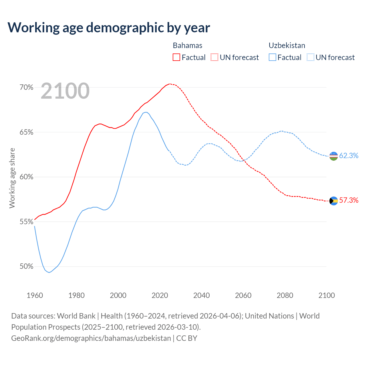 - The Bahamas has 285K working age adults (aged 15-64) vs 23.9M in Uzbekistan.