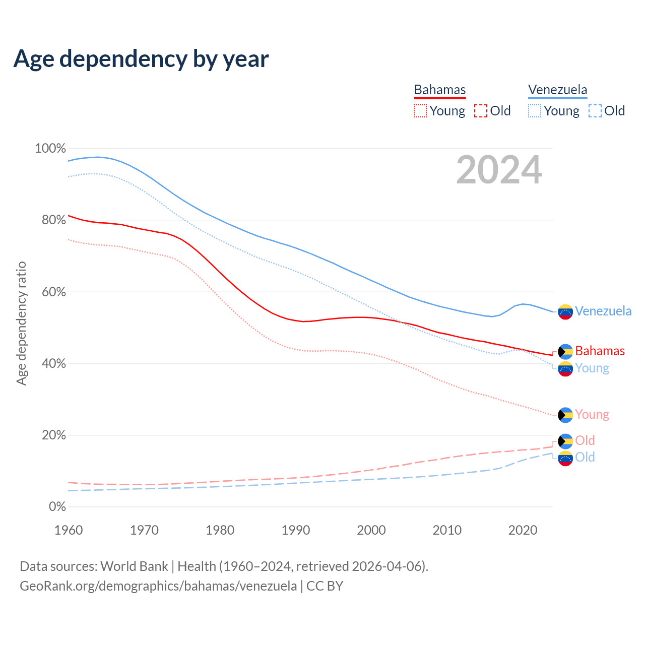 Data sources: World Bank | Health (1960–2024, retrieved 2026-04-06); U.S. Census Bureau (1960–2024, retrieved 2026-02-08).