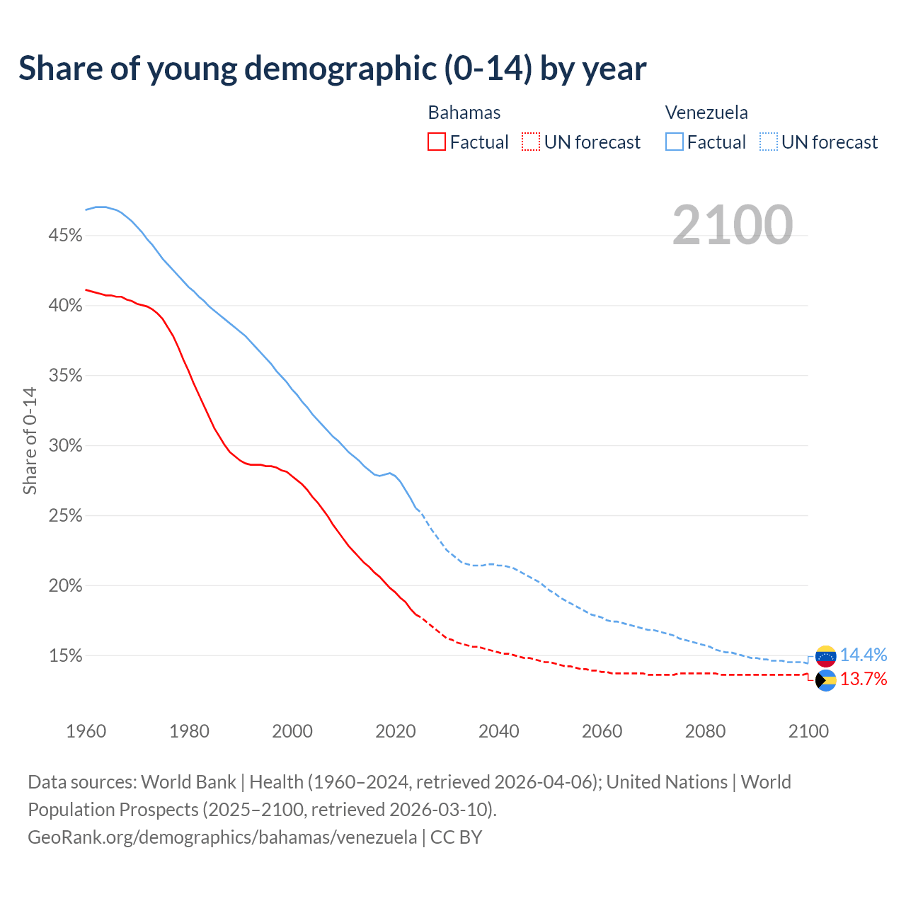 - The share of young demographic (0-15 years old) in the Bahamas is 17.9% vs 25.5% in Venezuela.