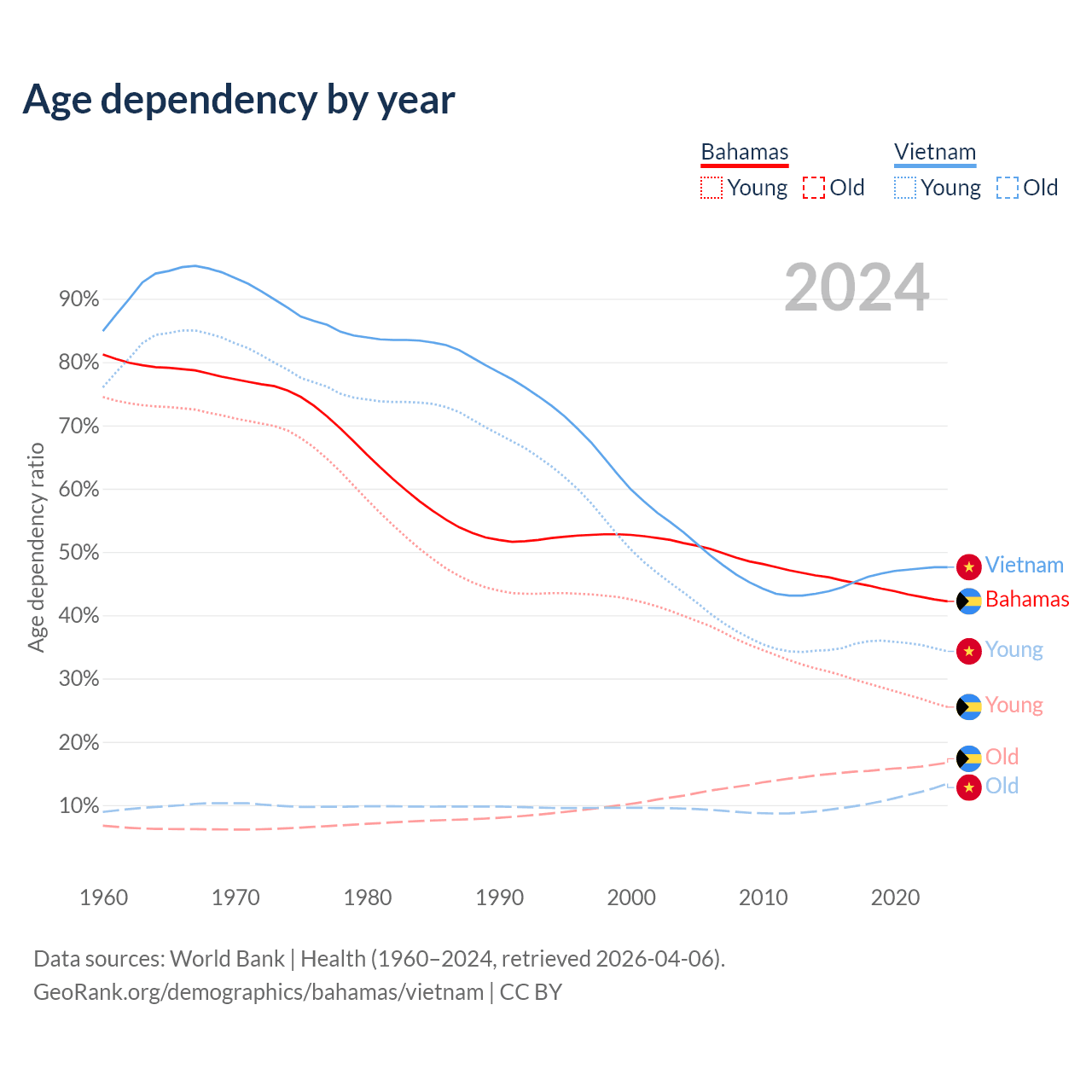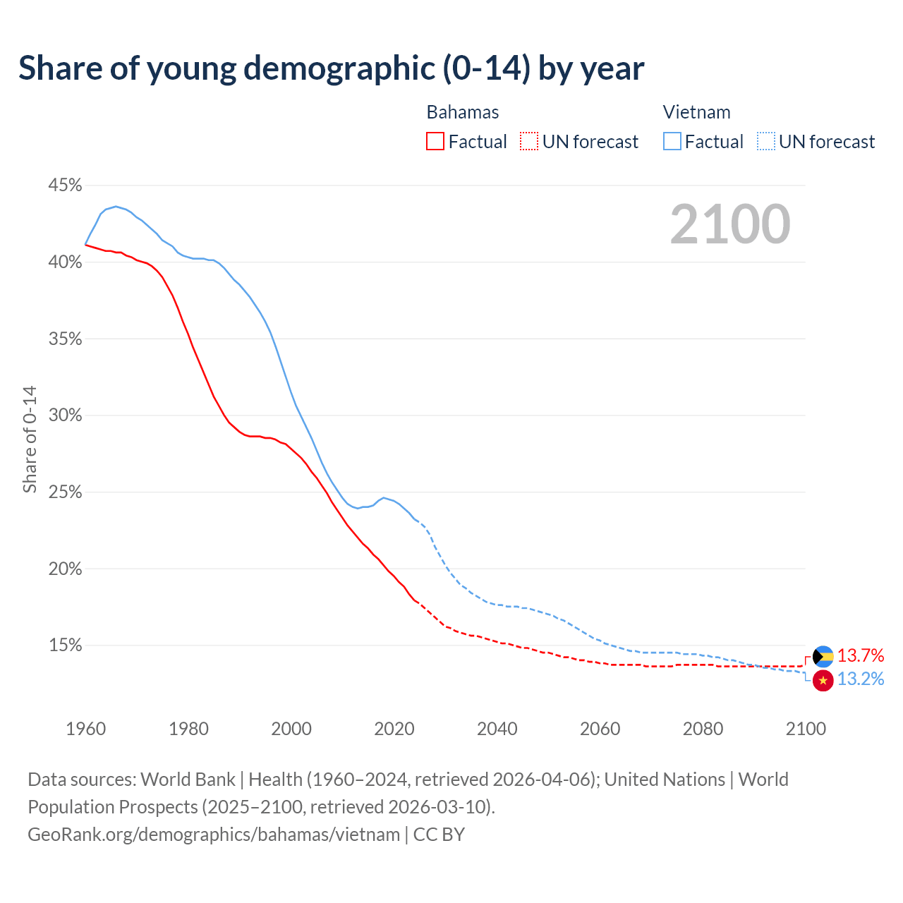 - The share of young demographic (0-15 years old) in the Bahamas is 17.9% vs 23.2% in Vietnam.