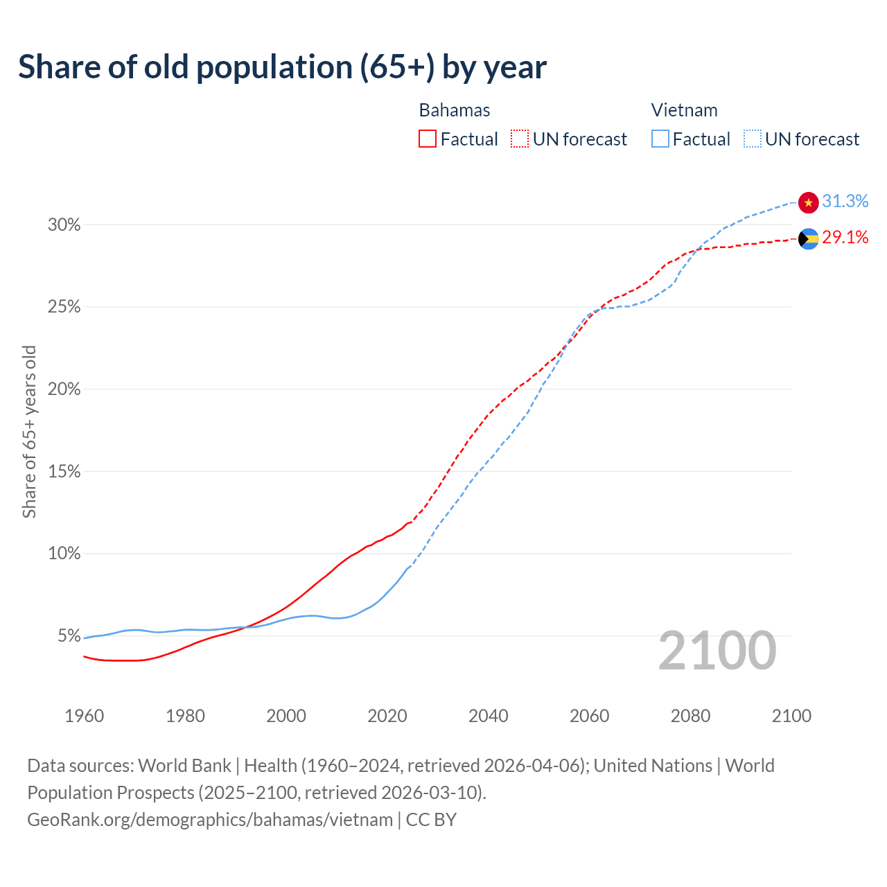 The share of older people aged 65 and over is 11.8% in the Bahamas and 9.05% in Vietnam. Life expectancy in the Bahamas compared to Vietnam .
